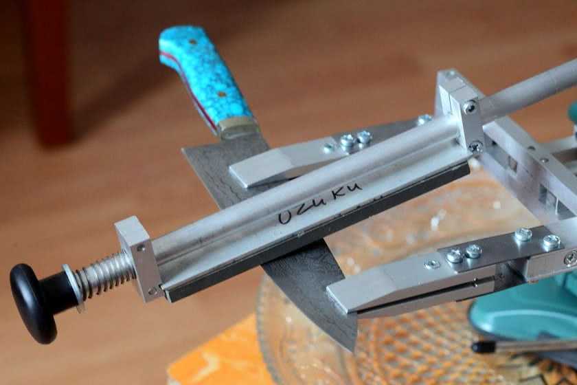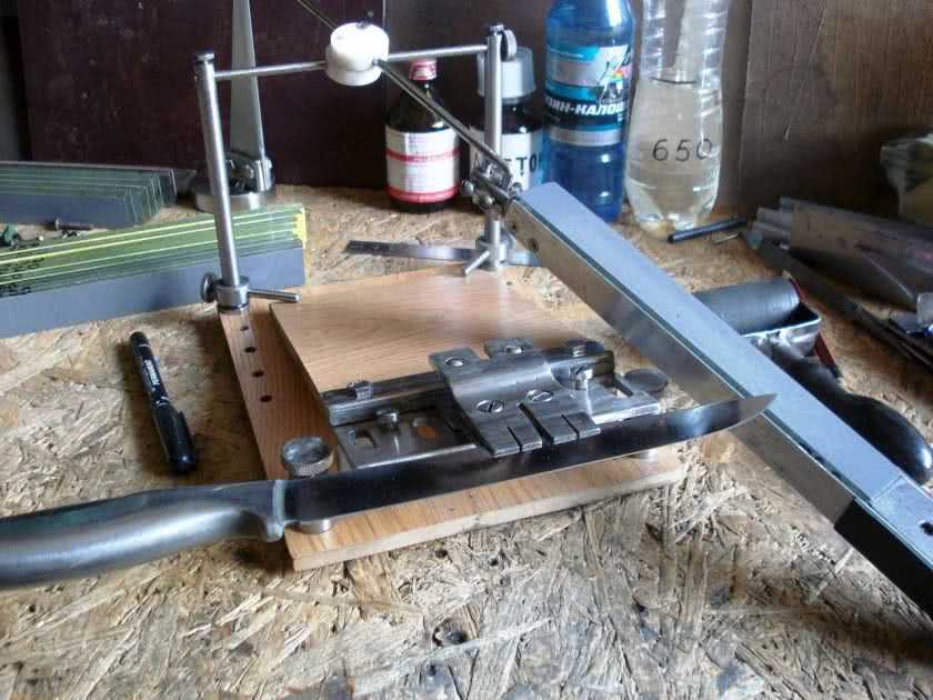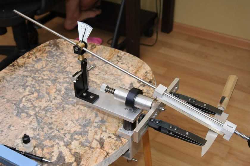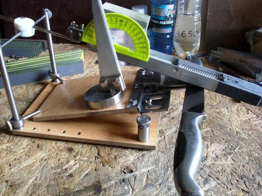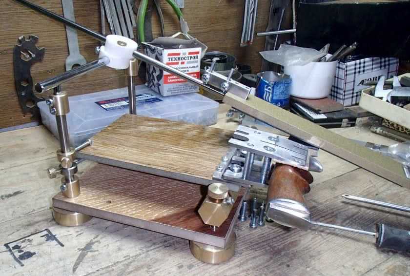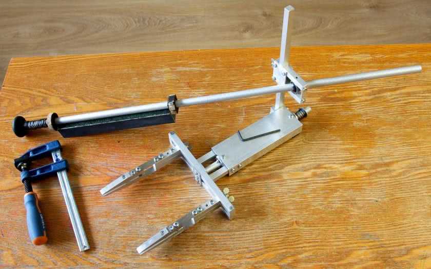 Особенность данной конструкции заключается в том, что для нее нет необходимости изготавливать основание — все элементы конструкции на время заточки ножа можно закрепить прямо на рабочем столе.