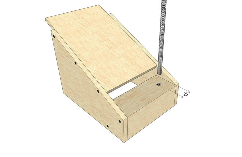 - В нижней части платформы делают круглую выемку Ø20 мм. Глубина ее должна спрятать гайку вровень с нижней поверхностью деревянного основания станка.