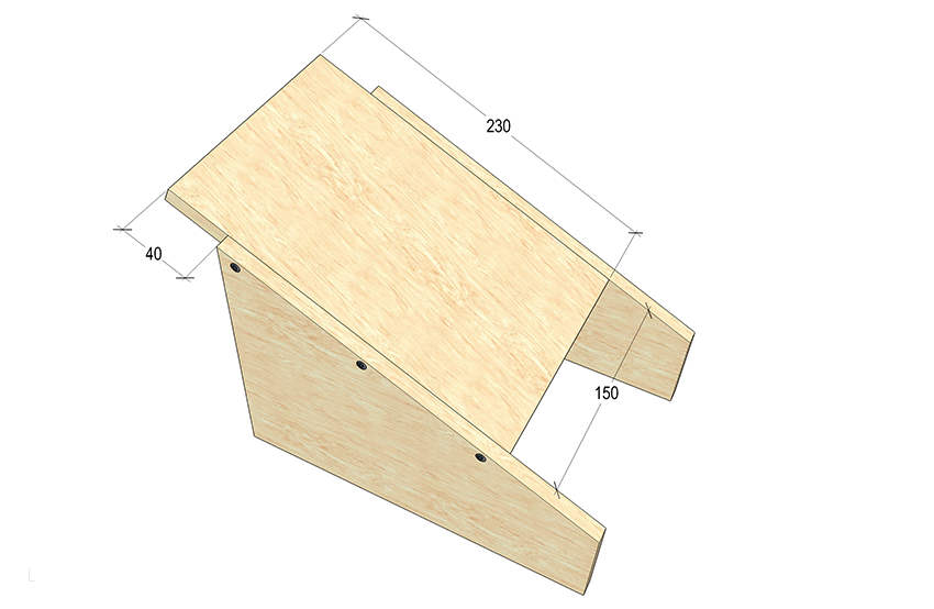 Устанавливает между наклонными стенками по бокам 3 деталь — наклонную поверхность из фанеры таких размеров 230 х 150 мм.