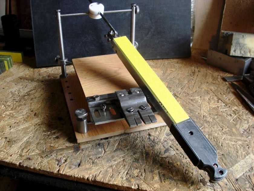 Также это может быть брус, закреплённый на импровизированной дрезине. Заточка совершается путём движений вперёд-назад. Угол контролируется соотношением высоты бруска и рабочей основы. Всю конструкцию необходимо закрепить на неподвижной поверхности.