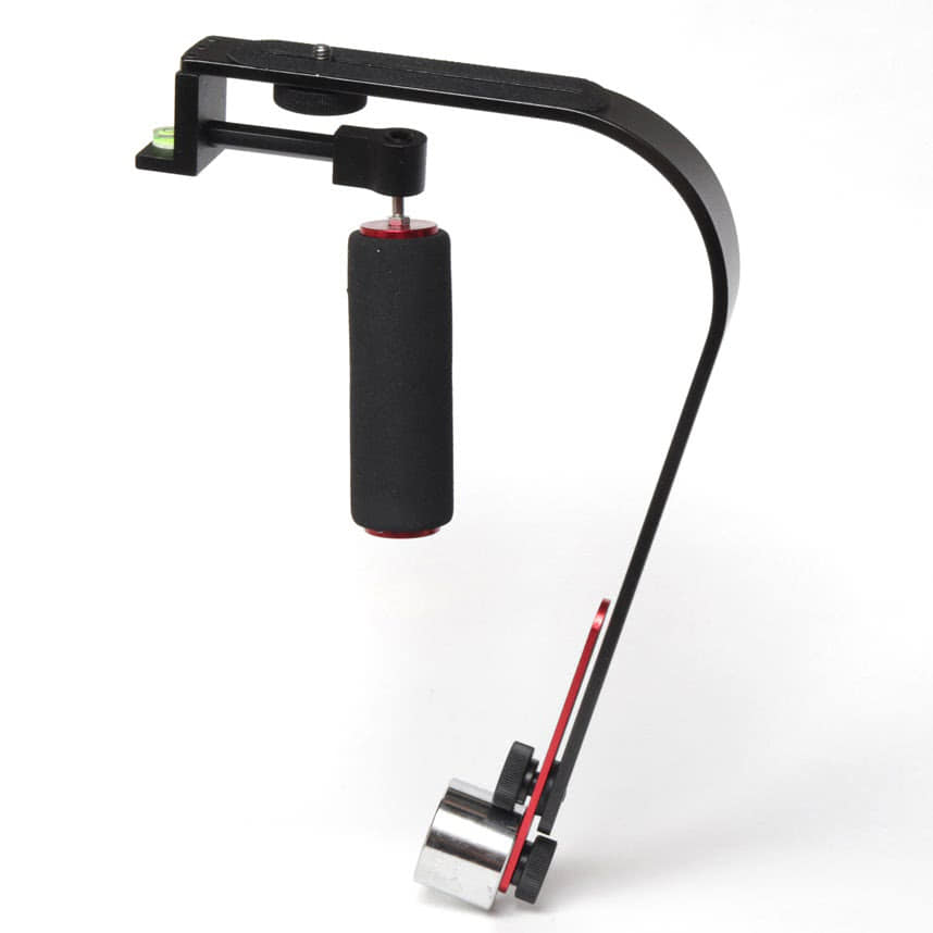В целом конструкция стабилизатора мало чем отличается от предыдущего варианта – те же шарниры, тот же противовес с грузиками. Но различия всё-таки есть. В этой модели используются как алюминиевые, так и стальные элементы, выкрашенные в чёрный или ярко-красный цвет. Ручка чёрного цвета из полимерного вспененного материала, напоминающего плотный мелкозернистый поролон. Размеры приспособления — 33х20х3см, вес – 1кг.