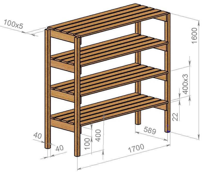 - Стеллаж изготавливают из простых и доступных пиломатериалов: квадратного или прямоугольного бруса и узкой обрезной доски. Правильно рассчитав материал, у вас не будет обрезков.