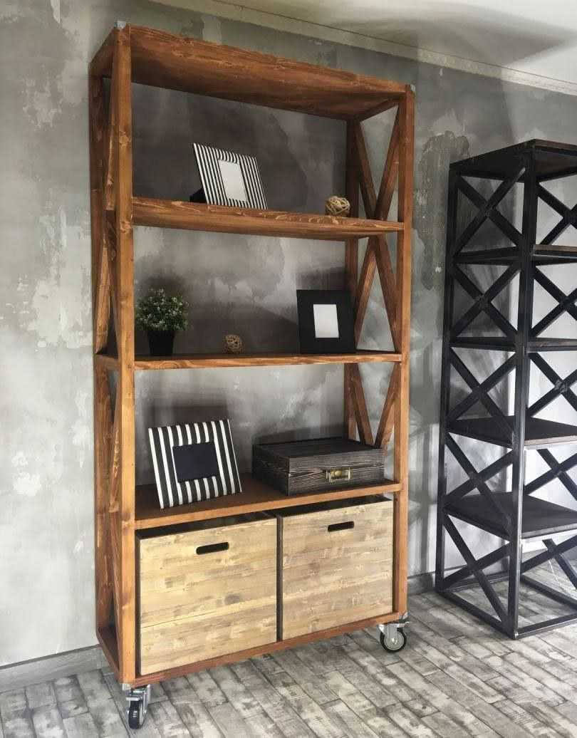 В современный интерьер может вписаться и более брутальный стеллаж. Схема стеллажей своими руками в этом случае не сильно измениться, но вам нужно будет подключить фантазию для выбора креплений.
