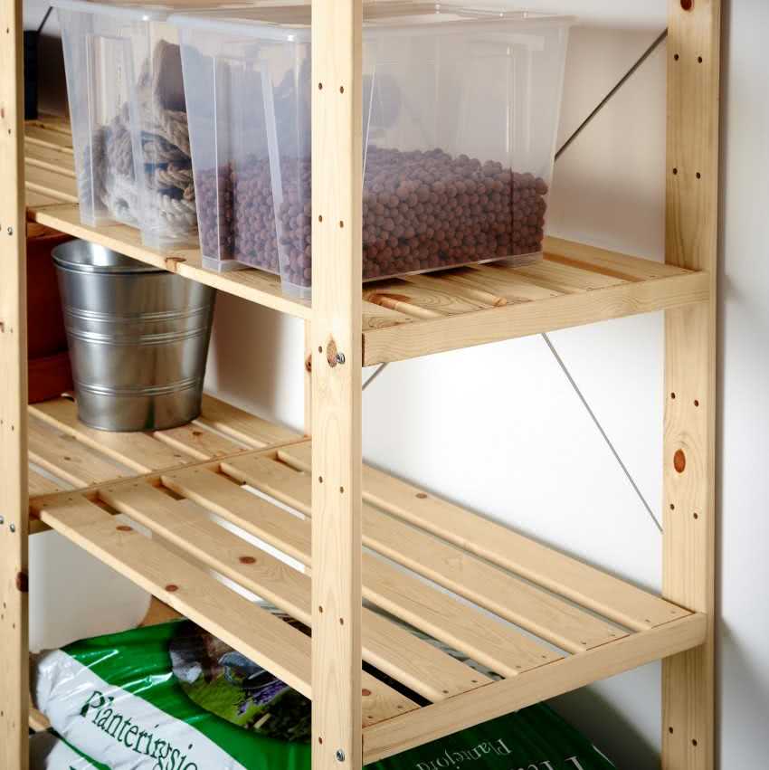 В темной кладовке эстетика может и не столь важна, но если речь идет о балконе или лоджии, внешний вид стеллажа уже имеет значение. Обычная сосна выглядит скучно, а использовать породы с красивой фактурой — это дорого и не очень умно для рядовой хозяйственной конструкции. Отличный компромисс в этом случае — использование морилки.