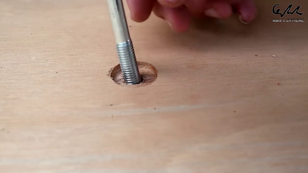 В столешнице намечаем отверстия для закрепления ее на рамке, просверливаем их, делая углубление для шляпок болтов. По отверстиям в столешнице намечаем отверстия в рамке и тоже просверливаем их сверлом на 9 мм.