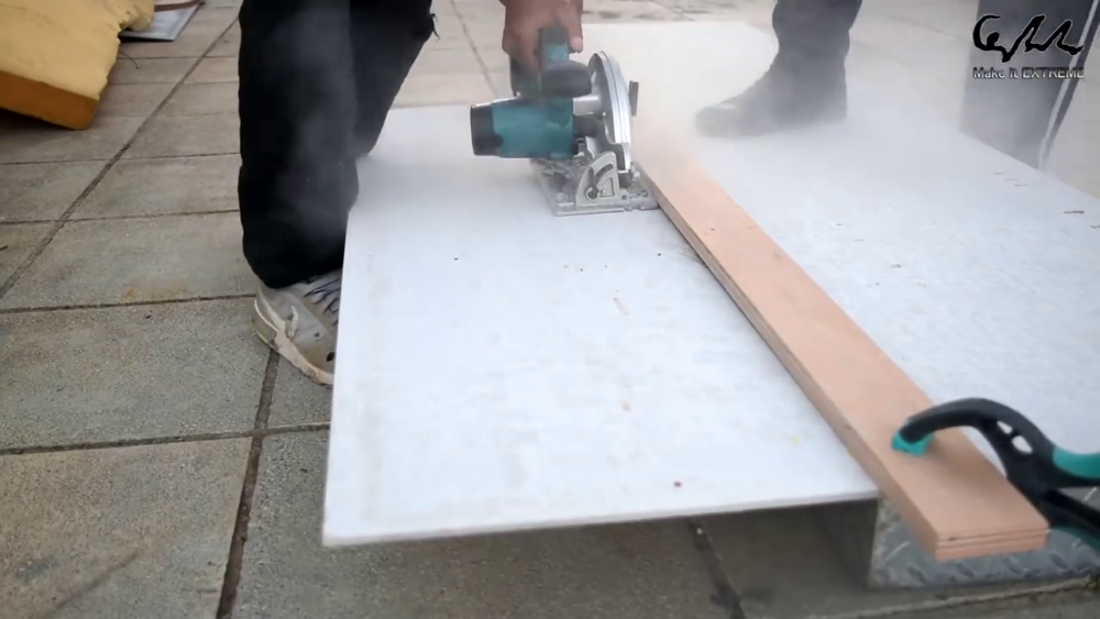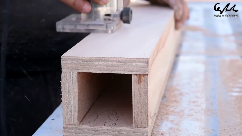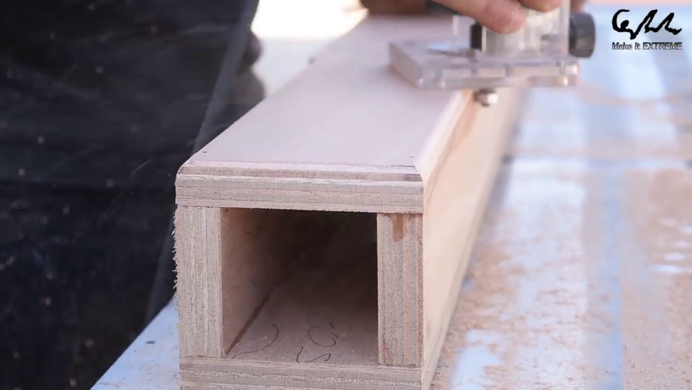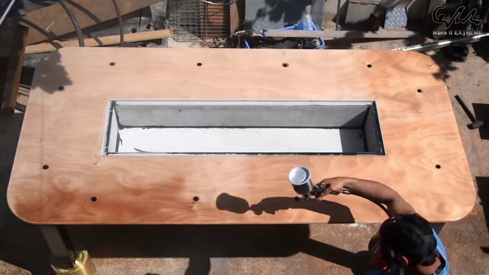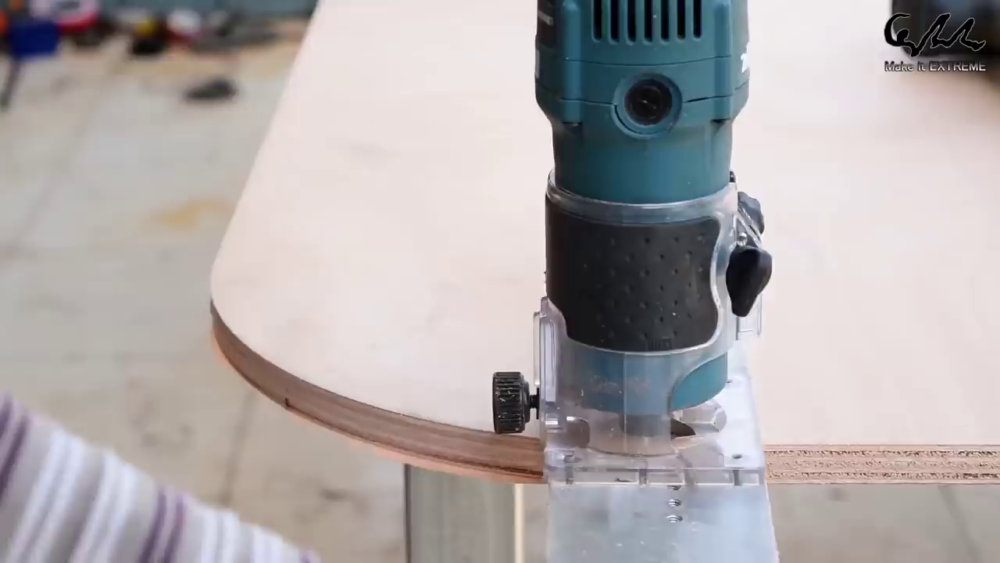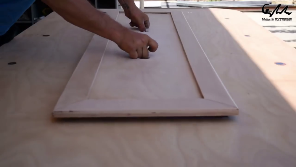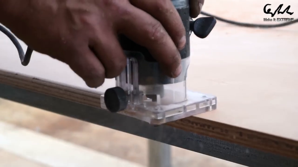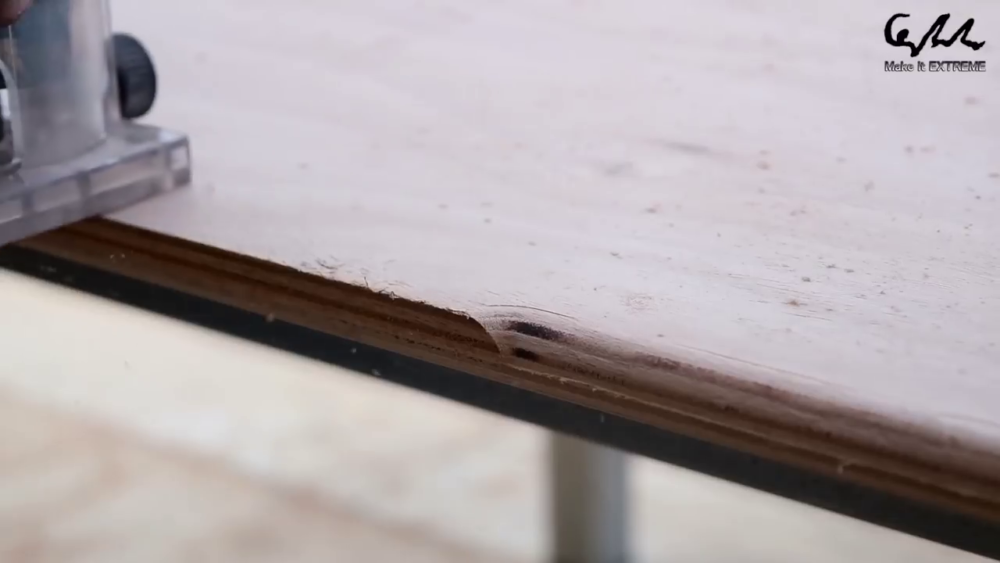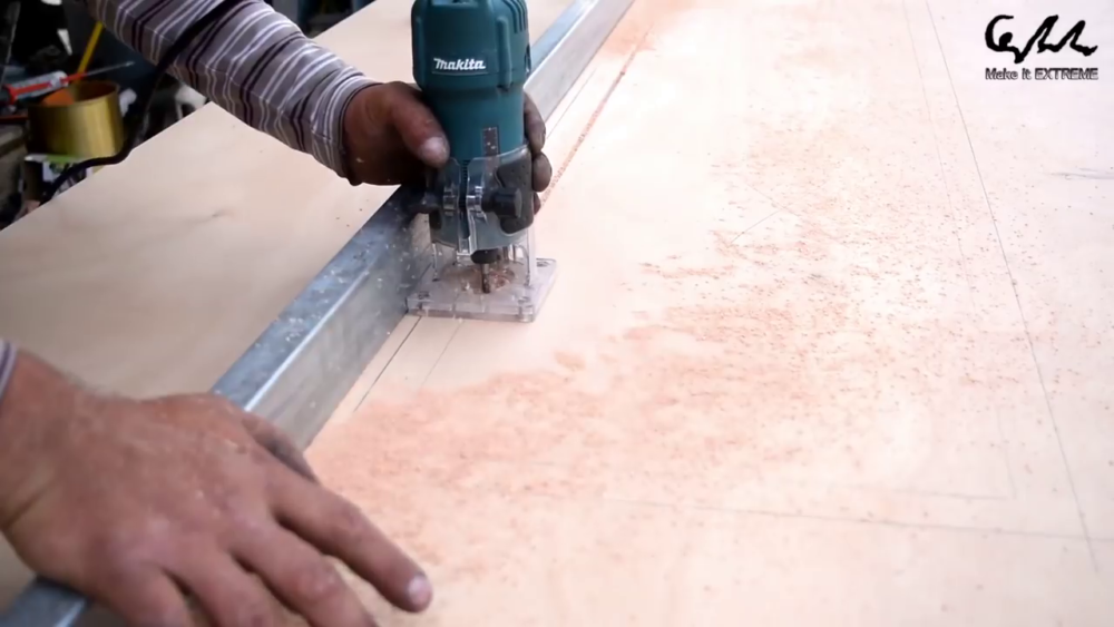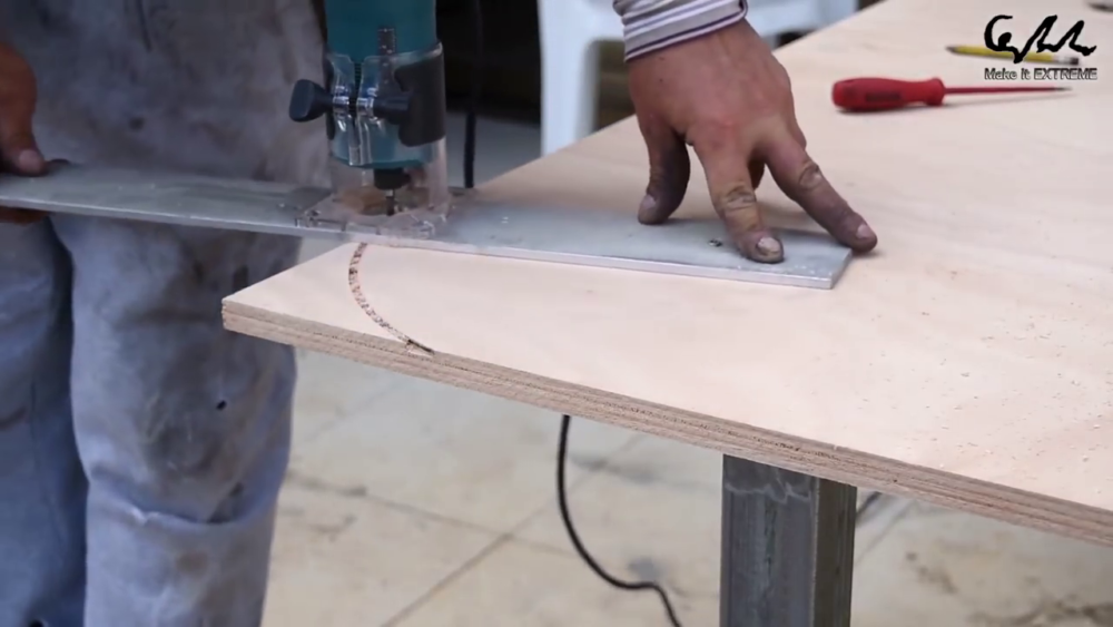 Берем лист фанеры размером 3000х1500 мм укладываем на основание. Электрофрезой скругляем углы фанерной плиты и обрабатываем кромку листа, вырезаем в центре листа прямоугольное отверстие под короб барбекю.