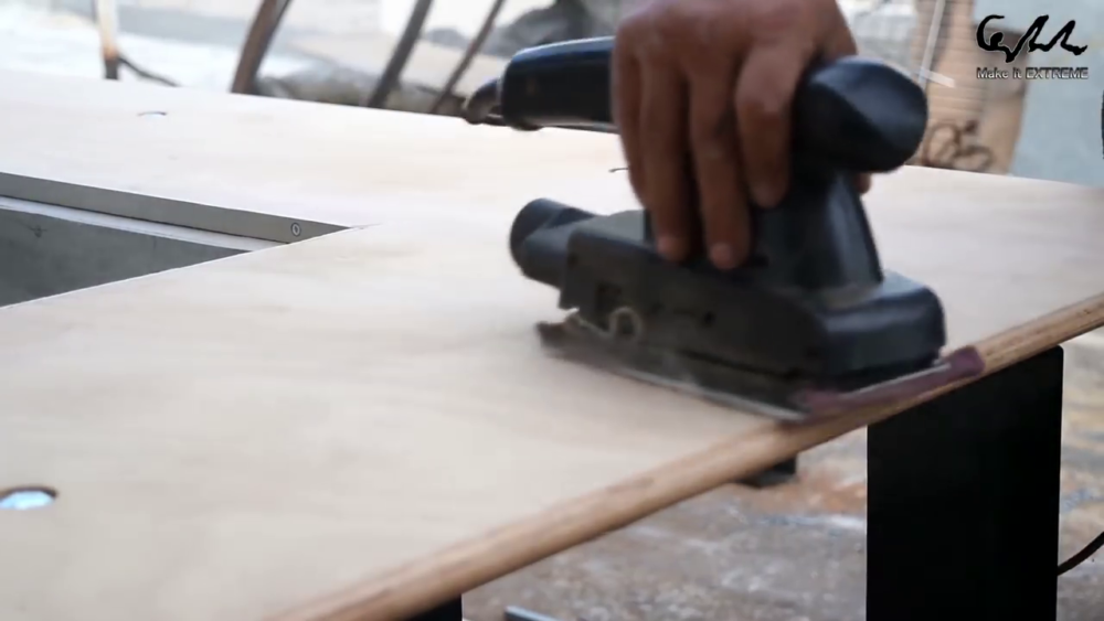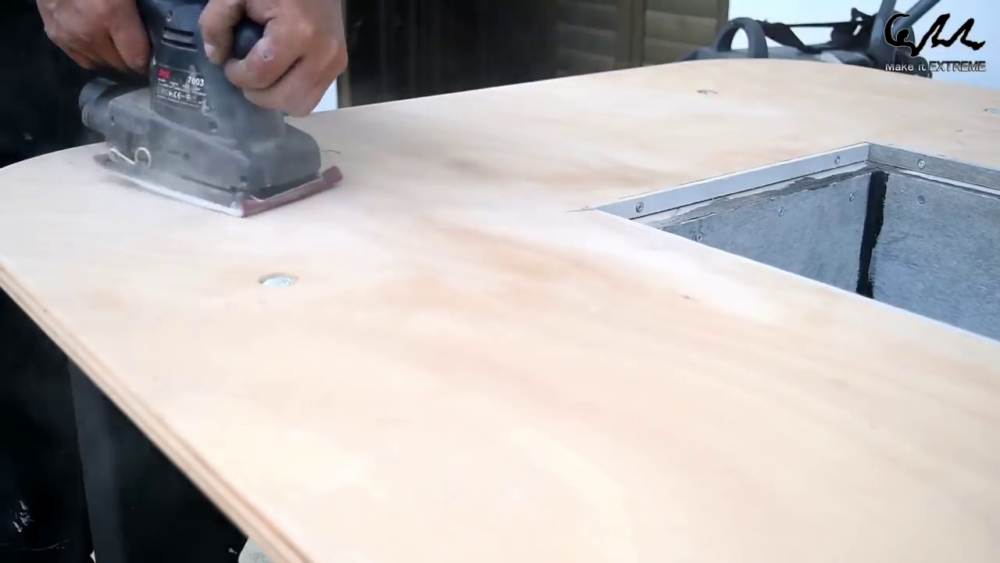 Изготавливаем из листа фанеры 6 мм и полосок из фанеры 15мм крышку ниши барбекю на столе. Зашлифовываем ее.
