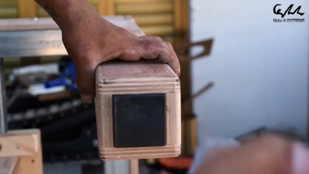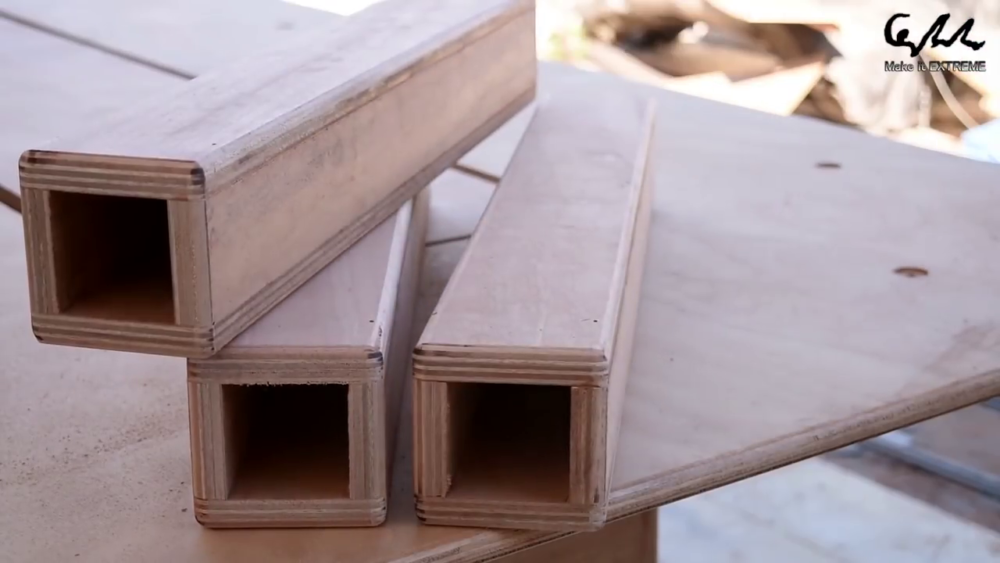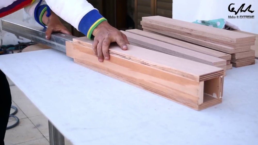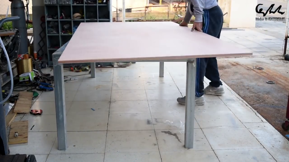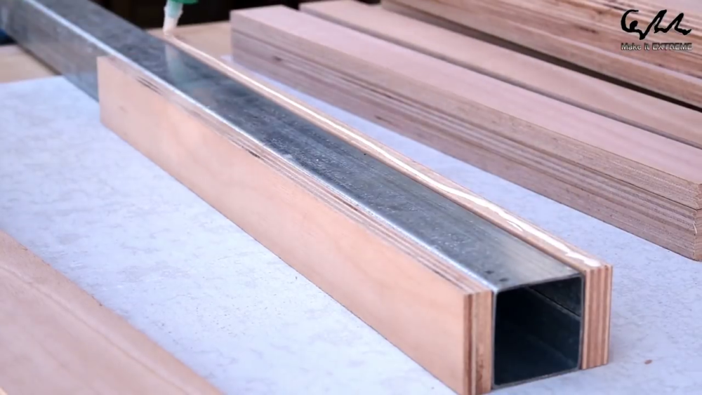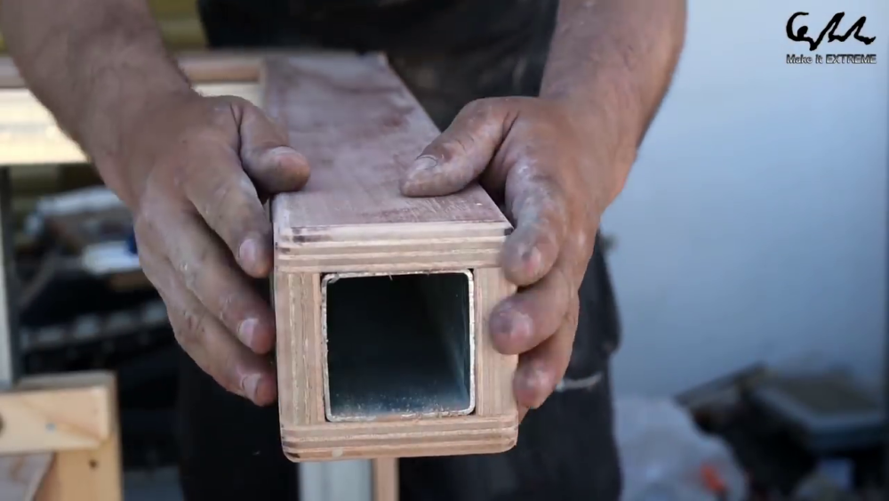 Далее из фанеры собираем деревянные ножки стола. Для этого полоски фанеры склеиваем вокруг квадратной профильной трубы 50х50. Затем трубу вынимаем из заготовки ножки, углы опиливаем фрезой, зашпаклевываем и шлифуем поверхность ножек. Надеваем деревянные ножки на металлические, закрепляя их с помощью клея. Незабываем установить пластиковые заглушки в металлические ножки.