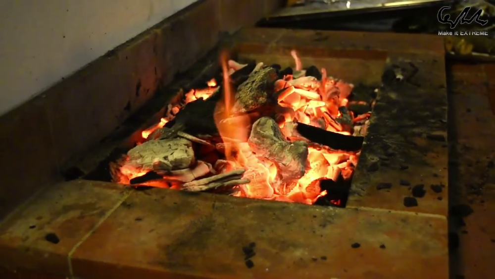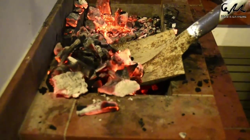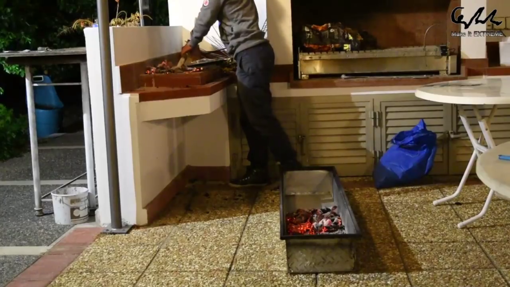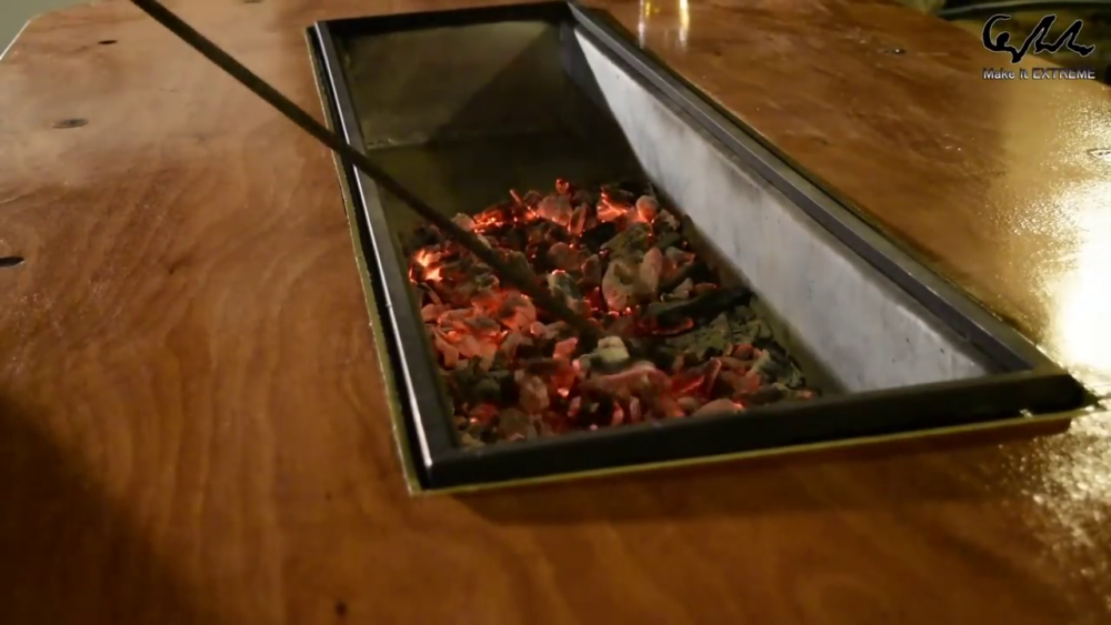Готовим угли, перекладываем их в наше барбекю. Барбекю несем и устанавливаем в стол. Для удобства переноски барбекю с углем, во избежание неприятных ожогов, к металлическому коробу по периметру приваривается квадратный профиль 12х12 с резьбовыми отверстиями М8 на торцевых сторонах короба. В эти отверстия можно вкручивать специально подготовленные ручки для переноса. Профиль же дополнительно будет служить ограничителем для гриль-решеток.