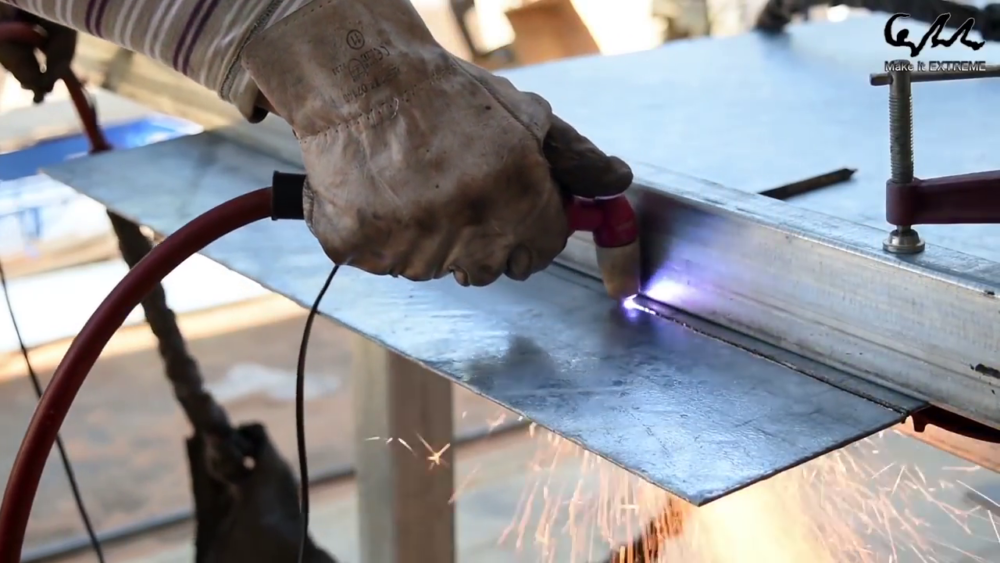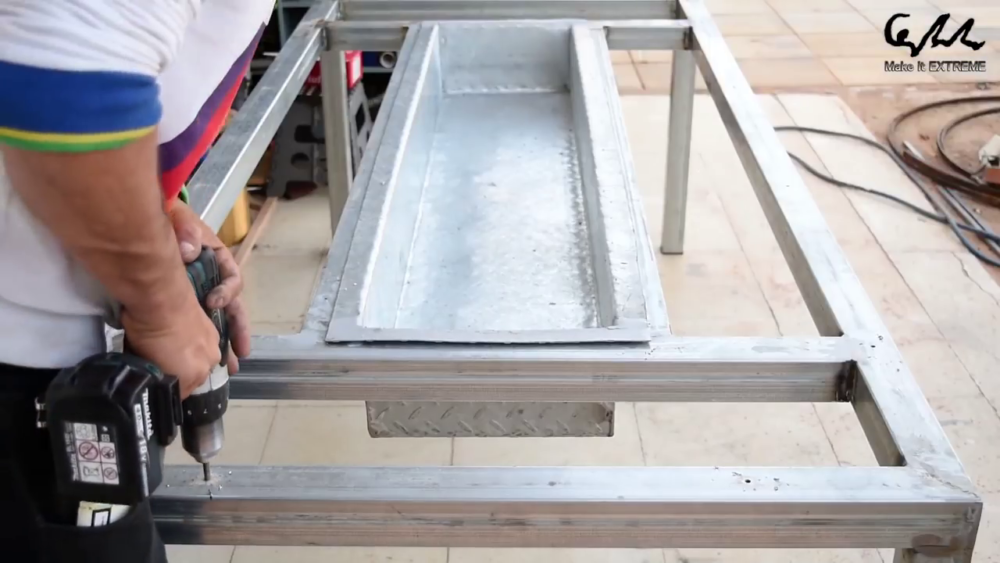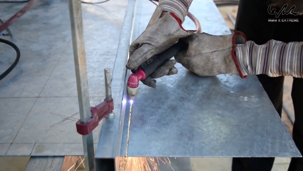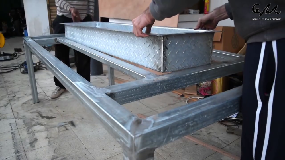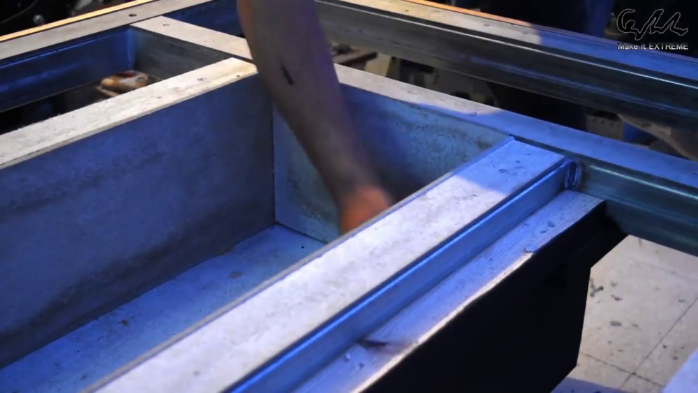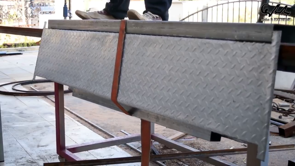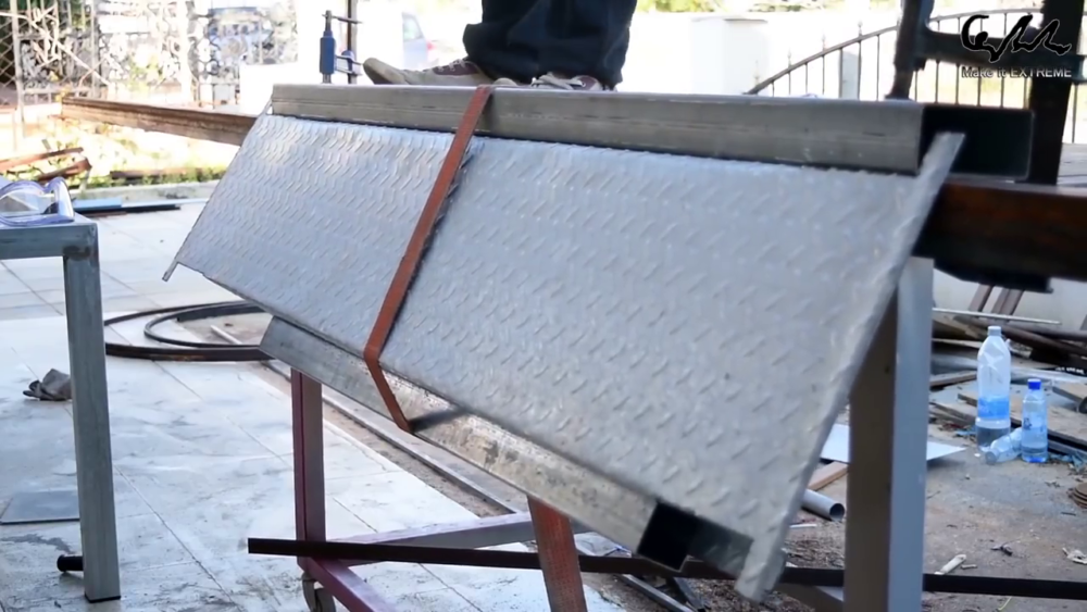 Лист металла раскраиваем и сгибаем в короб с бортами, угловые стыки короба свариваем. Сгибать можно, зажав лист между профилями и ударяя по нему резиновой киянкой.