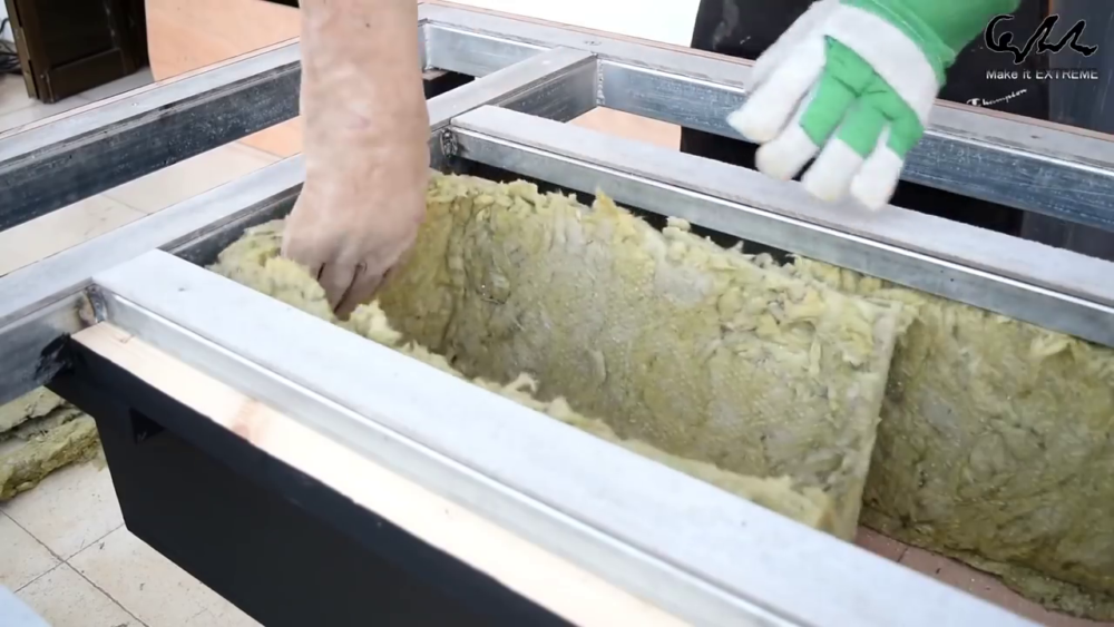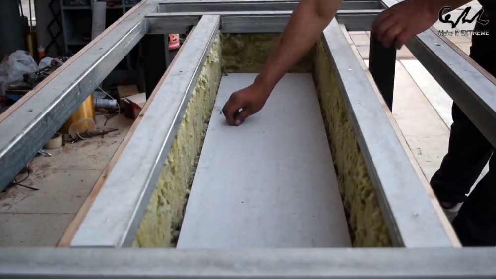 Раму лучше всего сделать из квадратных труб. Итоговый размер будет 51 х 48 х 96 см. Сварочные магниты помогут сохранить форму квадрата. Сверху необходимо сделать несколько прорезей для последующей изоляции из глины, а снизу приварить ролики.