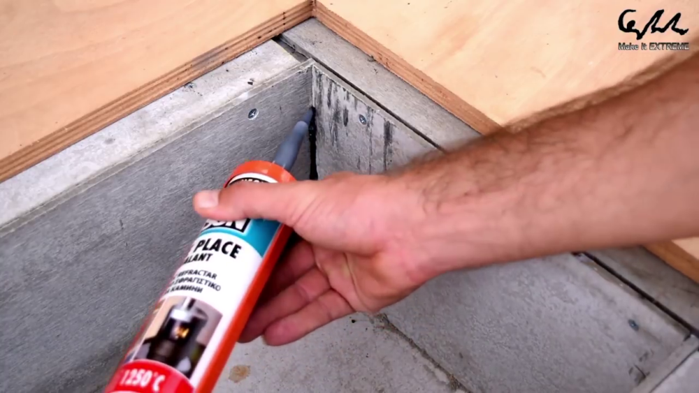 Внутренние углы между азбестовых листов уплотняем высокотемпературным герметиком.