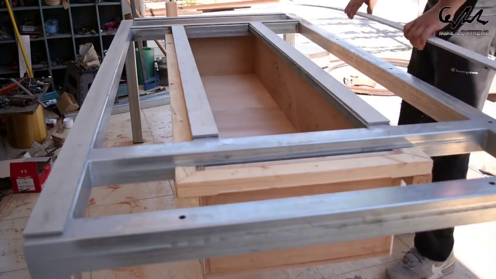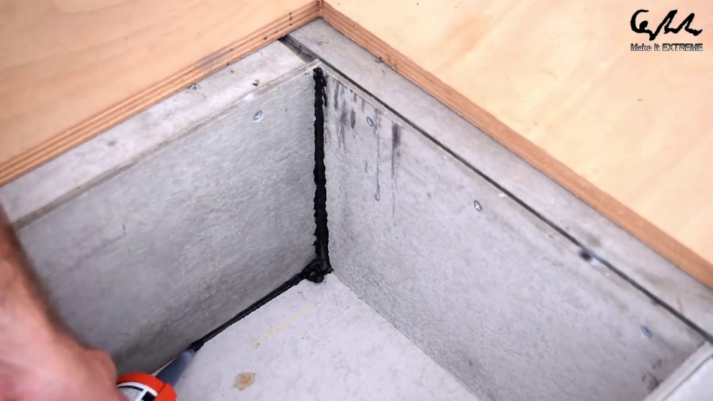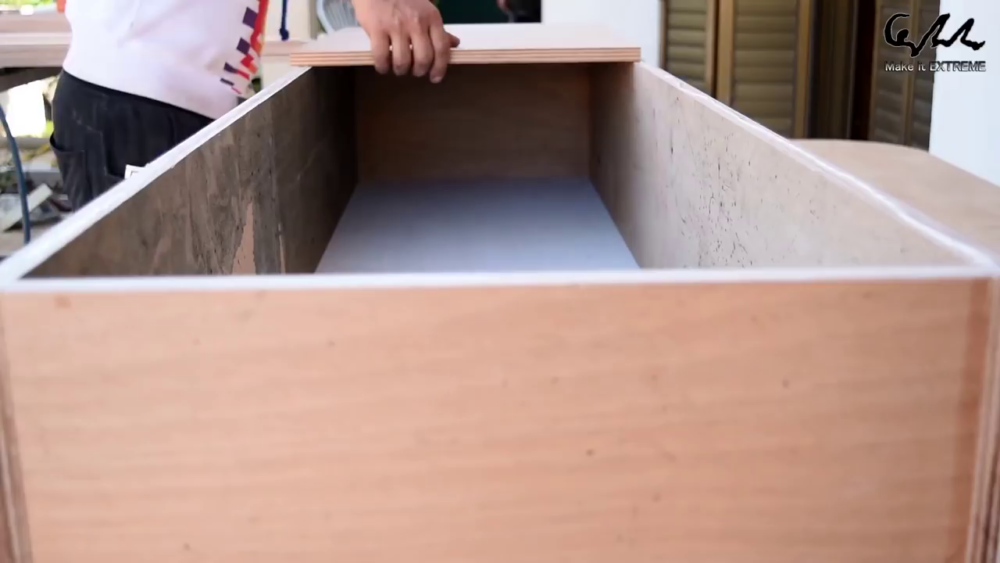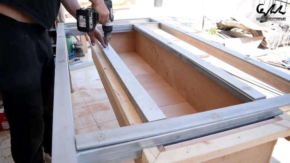 Далее из фанеры собираем короб с внутренними размерами большими металлического короба на 10 см.
