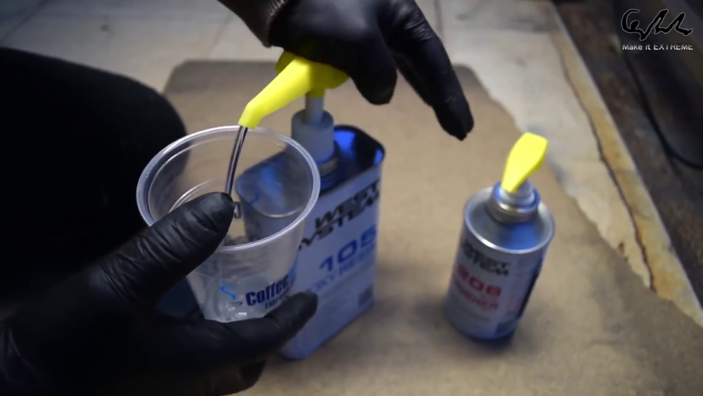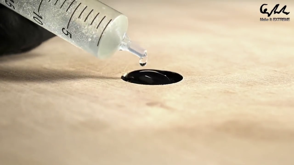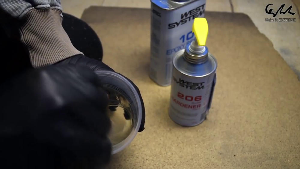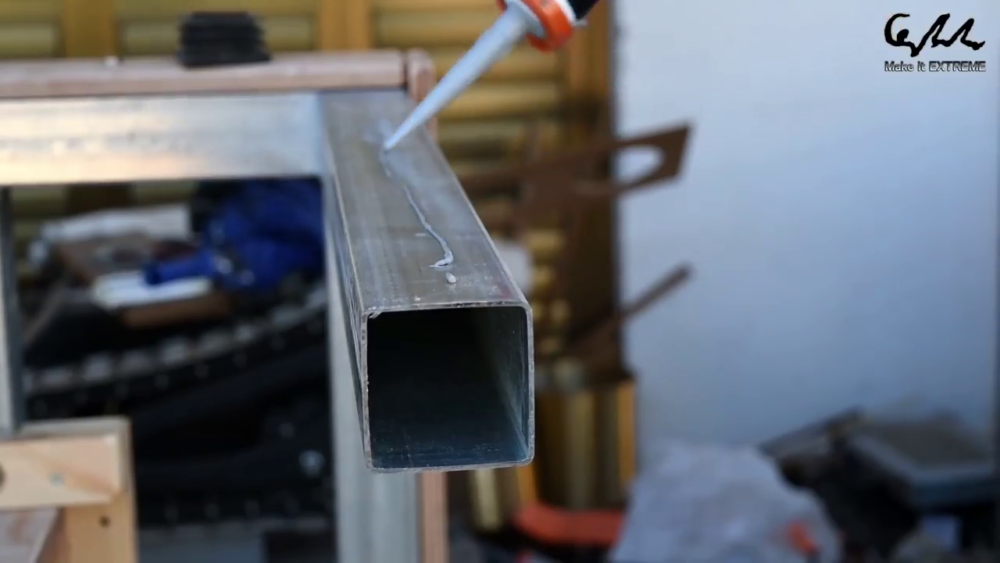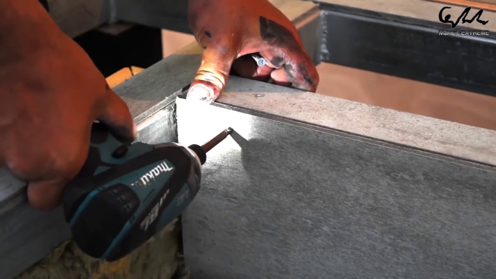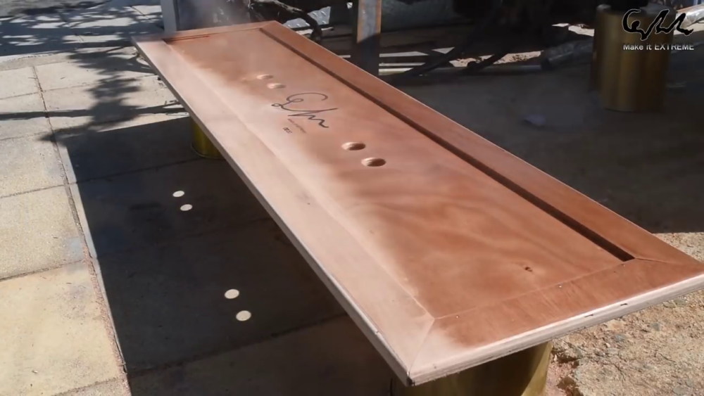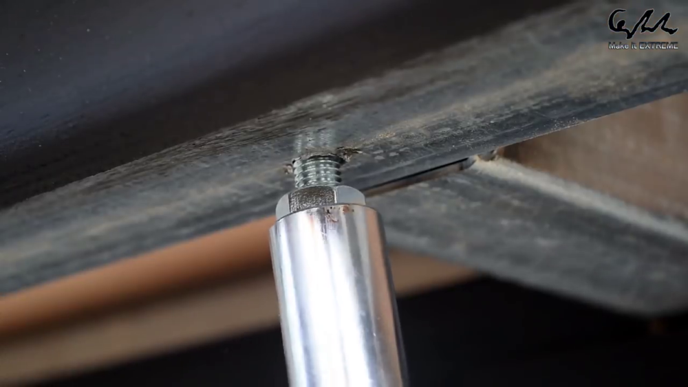 Закрепляем столешницу к рамке болтами М8 с округлыми шляпками. Тщательно зашлифовываем поверхность столешницы. Углубления под болты с помощью шприца заливаем двухкомпонентной эбокситной смолой.