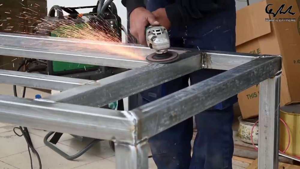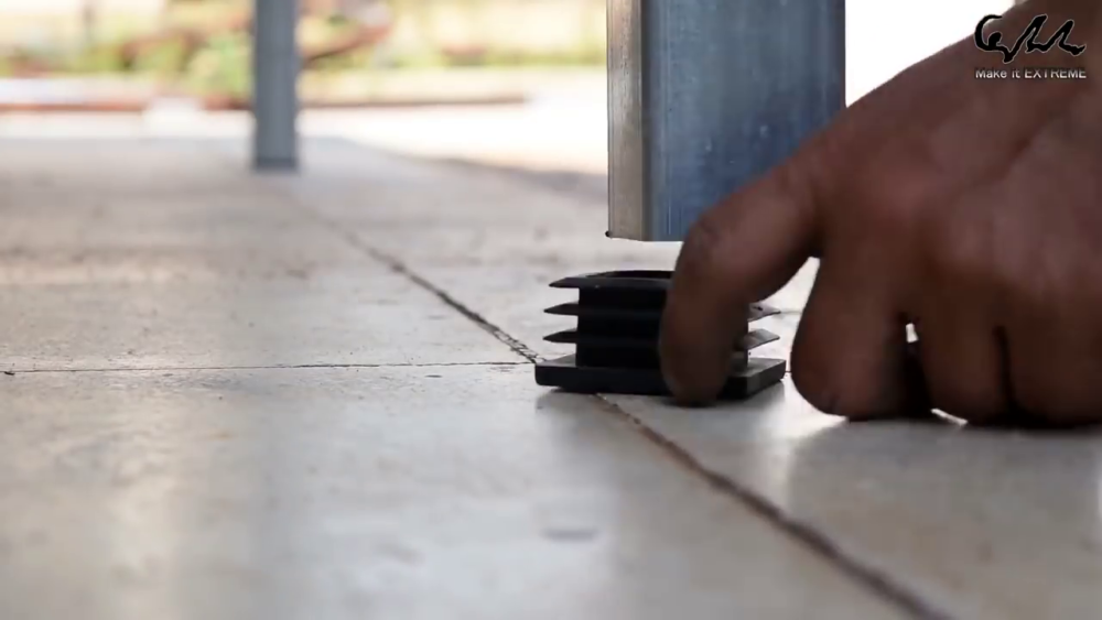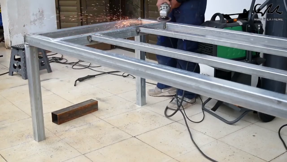 Отрезаем 4 куска профиля длинной 1 м и привариваем по углам рамки под прямым углом, это будут ножки стола. Все соединения профилей провариваем и сварочные швы зачищаем болгаркой. В ножки вставляем пластиковые заглушки. Основание нашего стола с барбекю готово.