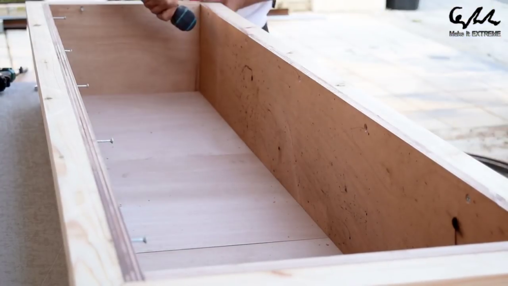 Шаг 7: Завершите коробку, закрепив боковые доски винтами спереди и сзади рамок. Закрутите шурупы изнутри ящика в наружные панели.