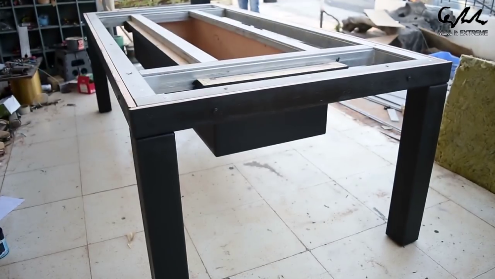 Закрепляем короб из фанеры на рамке стола. На верхнюю поверхность рамки стола закрепляем пластинки из листового асбеста, они будут предохранять столешницу от высокой температуры.