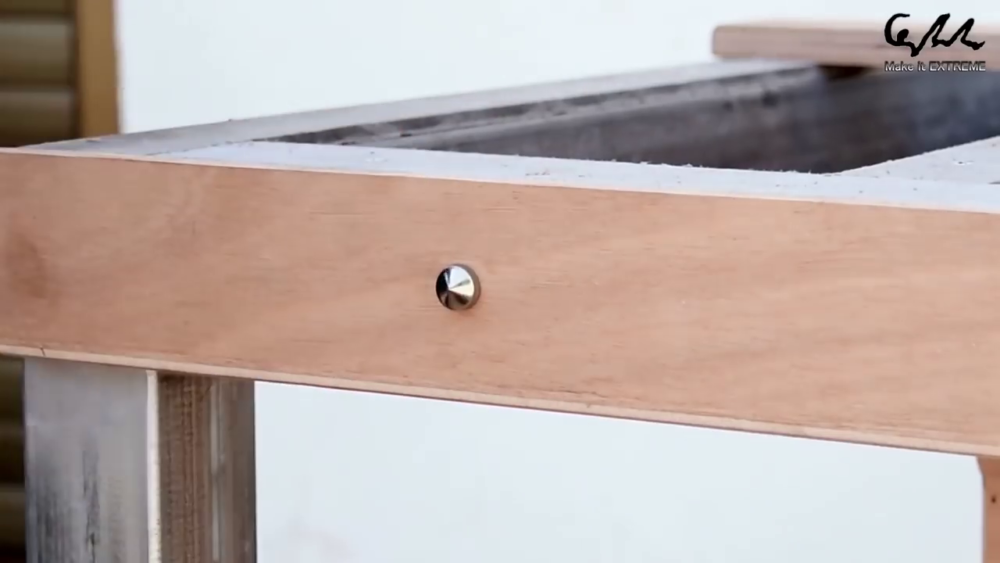 Наружную часть рамки стола закрываем полосой из фанеры, прикручивая ее саморезами с декоративными заглушками.