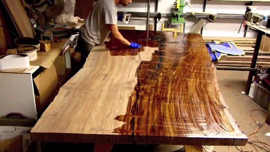 После того, как были сделаны все замеры и произведены необходимые распилы, потребуется зашлифовать шлифовальной машинкой каждый элемент будущего стола. Влажной губкой собирается появившаяся во время процесса пыль. После этого нужно покрыть дерево раствором – антисептиком от возможной влаги. Когда древесина высохнет, можно будет продолжить все работы.