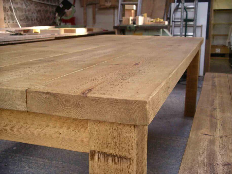 Некоторые специализированные сайты предлагают видеоматериал о том, как собрать деревянный стол. Для начала необходимо приготовить нужное количество качественных строганых обрезных досок и обработать шлифовальной машинкой. Высушенные доски располагают на верстаке, стыки промазывают поливинилацетатным клеем и скрепляют струбцинами.