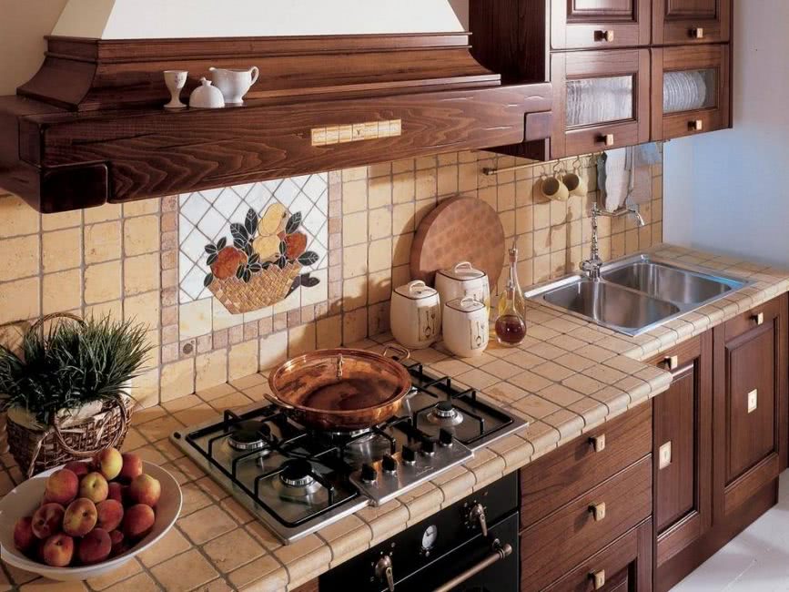 Традиционно для укладки столешницы используется керамика размером 15х15, если это не противоречит особенностям интерьера. Обычно маленькие детали используют для мелкогабаритной кухни, где чересчур крупная плитка будет смотреться просто неуместно.