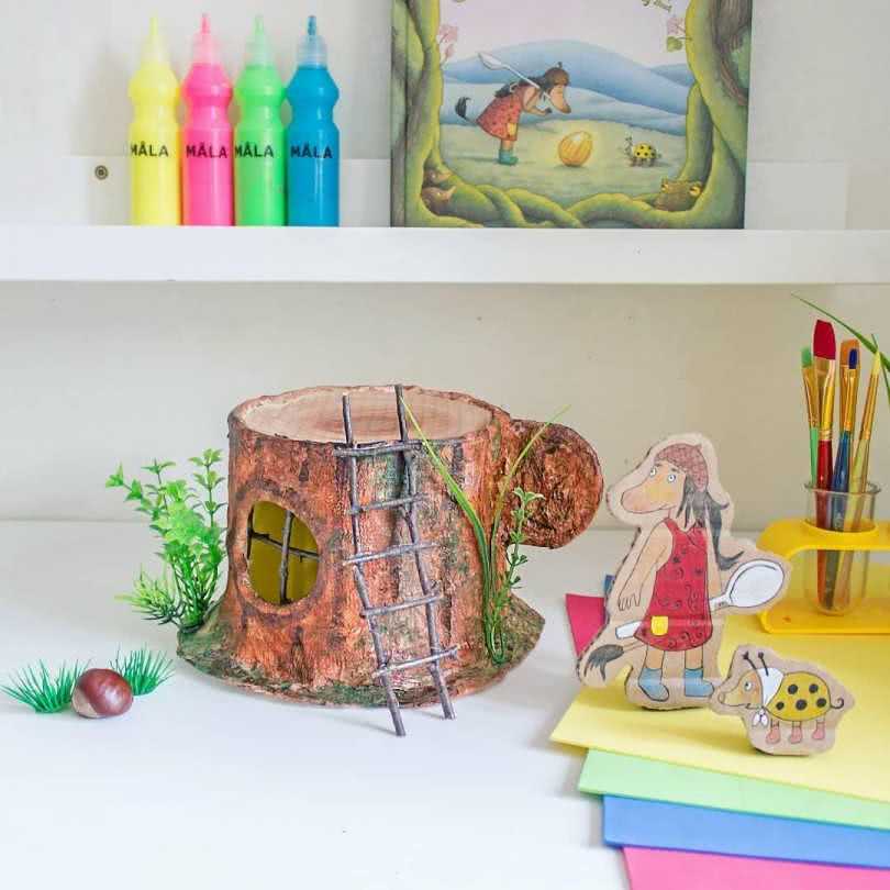 Вам понадобится: пень, бревно, молоток, пила, бензопила, зубило, ножовка, высокая трава для веника, резинка либо верёвка, для дорожки — кусочки рубероида, мелкий гравий, лейка с водой, обычный веник, заборчик, кисточка, краска, игрушки.