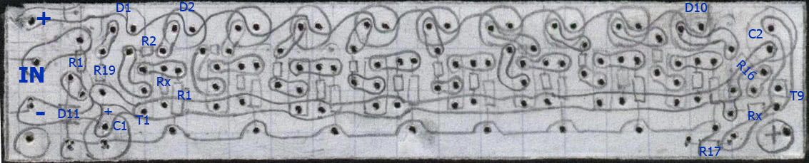 Все компоненты на печатной плате не обозначал поскольку ячейки идентичны и вы без особых усилий сами разберетесь что и куда впаивать.