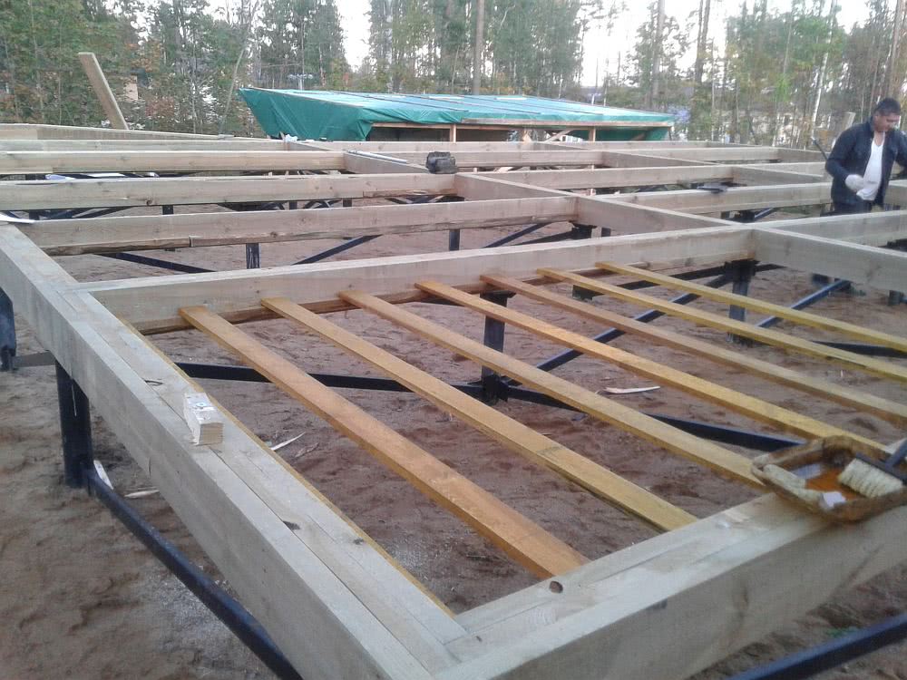 Сначала делают черновой пол, который для каркасного дома является одновременно и перекрытием. К обвязке фундамента закрепляют балки перекрытия. При этом следят, чтобы между фундаментом и деревом был слой гидроизоляции, чтобы древесина не начала разлагаться от естественной влажности. Для этого укладывают двойной слой рубероида или гидроизола.