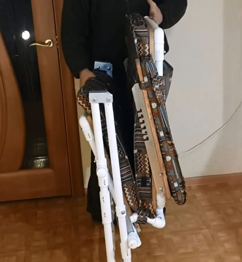 Чтобы собрать складной стул, потребуется полипропиленовая труба диаметром 25 мм, фитинги, материал для сиденья, нитки, 2 болта, 2 гайки. Руководство, как сделать складной стул: