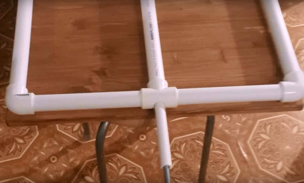 - К концам каркасных трубок прикрепляются оставшиеся четыре отрезка размером 55 см, которые будут выполнять роль ножек. На них устанавливаются насадки из резины.