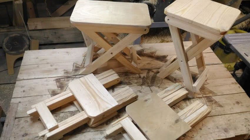 - Сначала изготавливается сидение и задние ножки, переходящие в устои. Далее выпиливаются передние ножки и шлифуются.