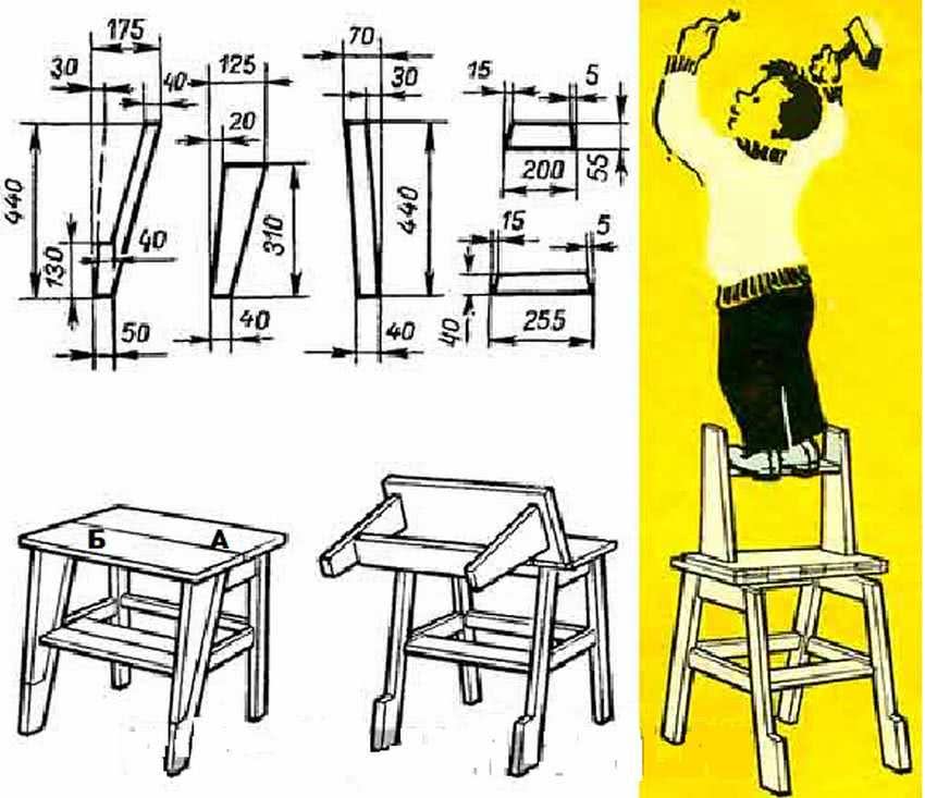 Рассчитаны стулья по ГОСТу на людей весом до 100 кг. Чертежи и размеры со стандартными параметрами можно использовать тем, чей рост и масса соответствуют средним данным. Остальным, чтобы узнать, как сделать стул, на котором будет удобно сидеть и не портить осанку, надо выполнить свои замеры. Для этого нужно присесть, держа ноги под прямым углом и измерить расстояние от пола до внутреннего сгиба колена – это будет высота до сиденья. Затем замерить длину от колена до бедра – это глубина стула. Расстояние от бедра до шеи поможет определить высоту от сиденья до верхнего края спинки.