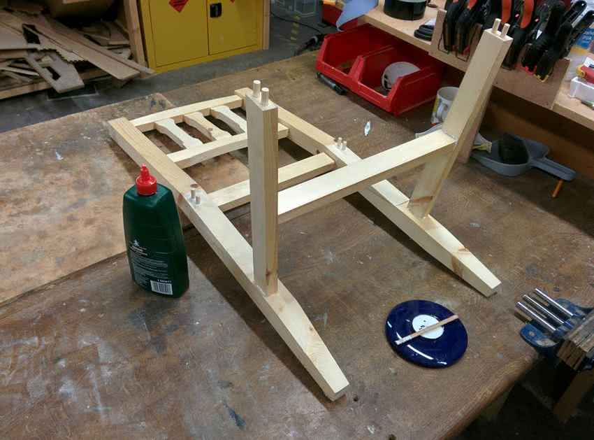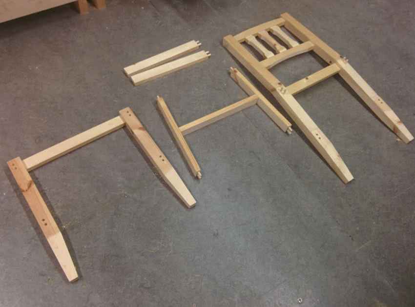 - Соберите из готовых обработанных деталей стул. Используйте клей, саморезы или деревянные шипы. После сборки нужно зафиксировать соединения струбцинами или специальным прессом до окончательного высыхания клея.