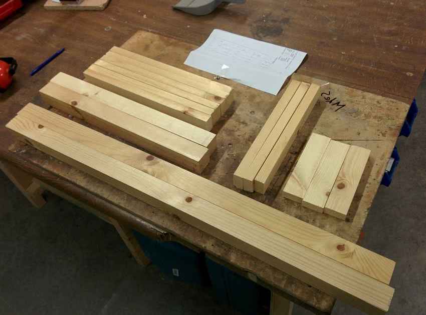 Раскроить дерево. Для этого надо разложить лекала на древесине по долевой, обвести контуры, после чего выпилить все детали согласно чертежу. Идентичные части сразу выровнять в размер. Должны получиться по 2 передние и задние ножки, 4 царги, 2 проножки, 2 поперечные рейки.