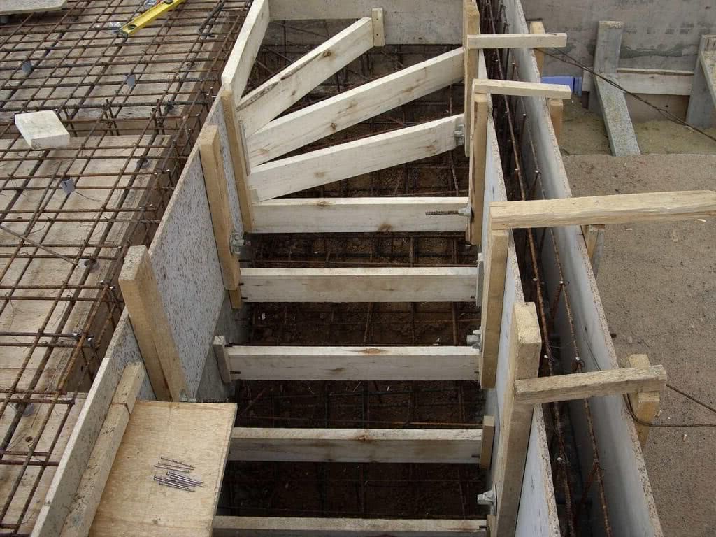 Кроме того для отделения ступеней между собой создаются ребра жёсткости, размещаемые по бокам. Опалубка размещается по периметру и подпирается специальными колышками, вбитыми в землю.