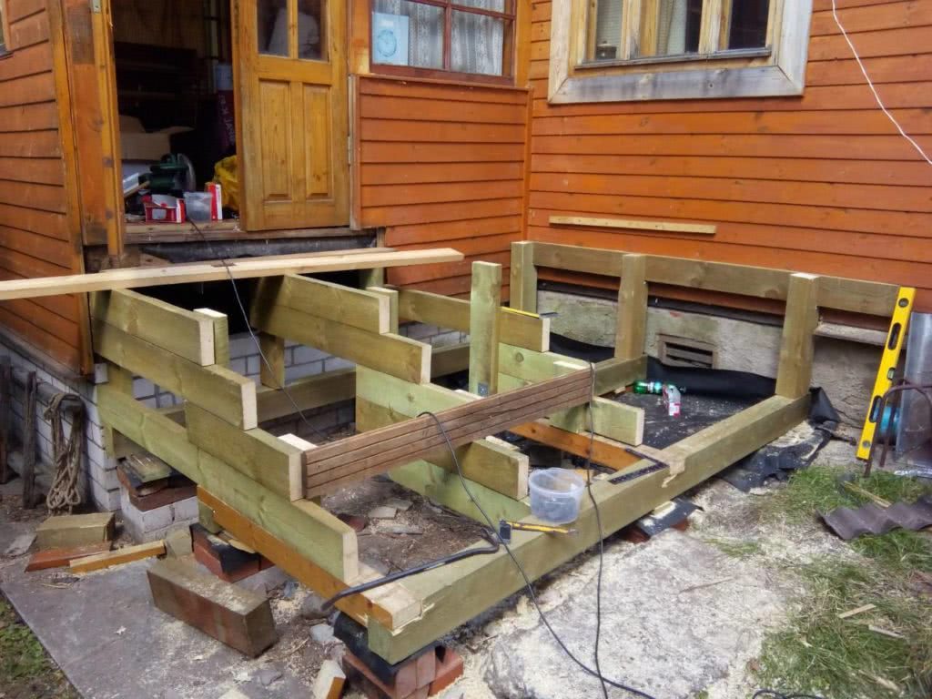 Для высокого крыльца рекомендуется построить дополнительное ограждение с перилами 0,8-1 м, закрепленное на сваях. В качестве замены поручней можно использовать особую конструкцию боковых стенок лестничного марша, обеспечивающую безопасность.