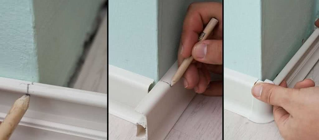 - Сделайте на материале отметки с помощью карандаша. Два изделия отрежьте под углом в 90 градусов, затем приложите их к стене и отметьте линию примыкания. Найдите точку соприкосновения плинтусов, затем разметку перенесите на материал, выполните отрез.