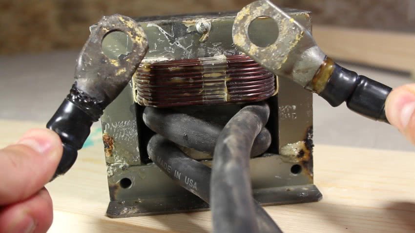 Если подключить к первичной обмотке 220 В, то на вторичной обмотке мы получим напряжение 2 В с силой тока около 800 А. Этого будет достаточно, чтобы за несколько секунд расплавить обычный гвоздь.