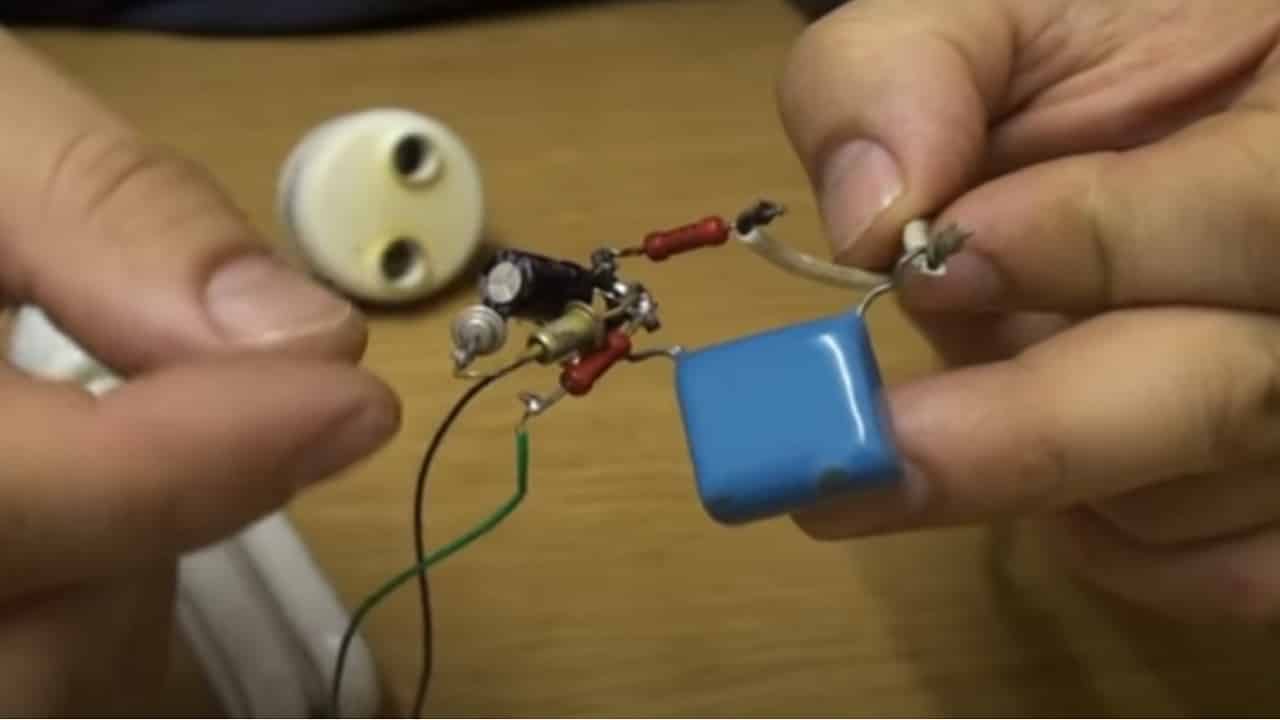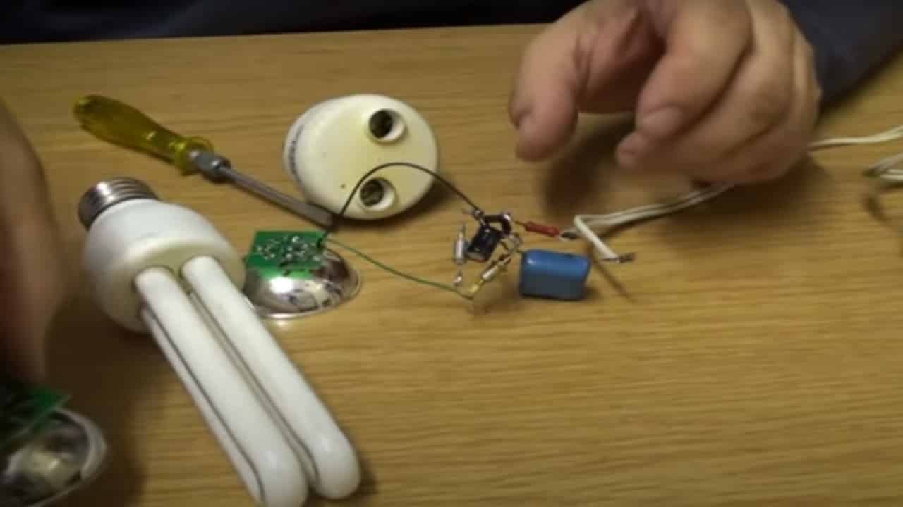 Удалите из корпуса остатки люминесцентной компактной колбы, верхнюю часть пластика и электронный блок. У вас должен остаться цоколь с выводами и пластиковый корпус.