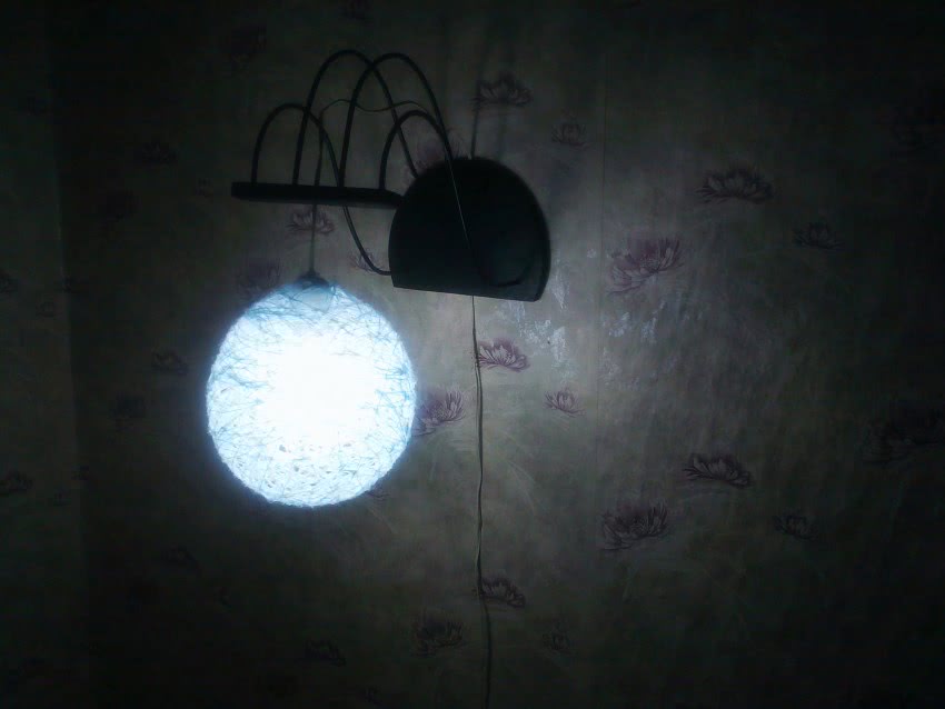 Сначала шар надуть до такого размера, который вам нужен. После чего очень быстро и обильно намазать шар клеем и обмотать нитками для вязания в хаотичном порядке. Обрезать нить и оставить шар на сутки. После того, как пройдет время, лопнуть шар и вынуть из ниточного шарика, который у Вас останется. Данную конструкцию можно сразу вешать на потолок. Главный плюс в том, что Вы можете подобрать цвет и толщину ниток сами.