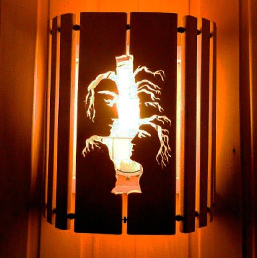 Подобное решение подойдет тем, кто в детстве любил вырезать картинки из журналов. Удивительно простой в исполнении светильник, который создаст в комнате загадочную, почти мистическую атмосферу.