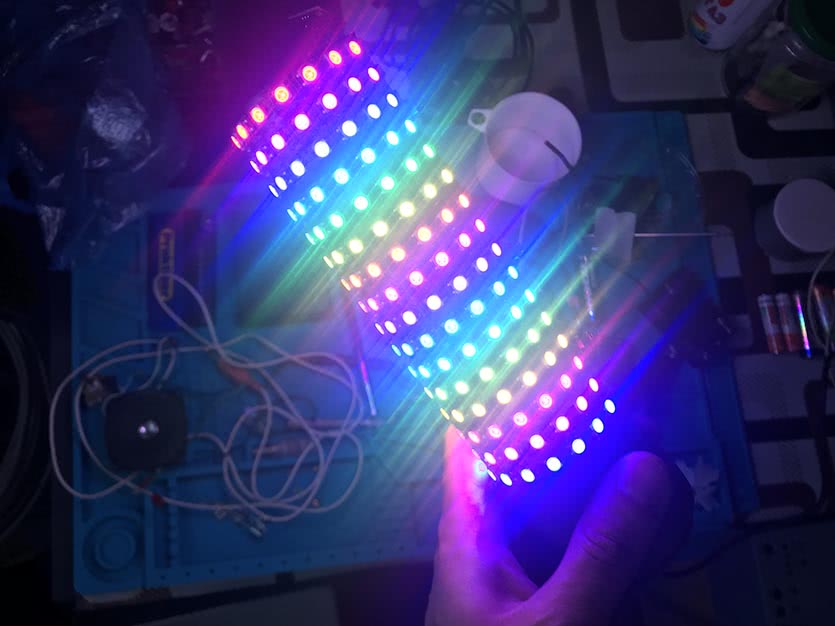 Теперь нужно намотать матрицу на трубу, заранее просверлив в ней отверстие для проводов, и собрать конструкцию воедино. Сенсорную кнопку нужно будет приклеить термопистолетом ко внутренней стороне верхней пробки, аналогично можно связать основание с днищем.