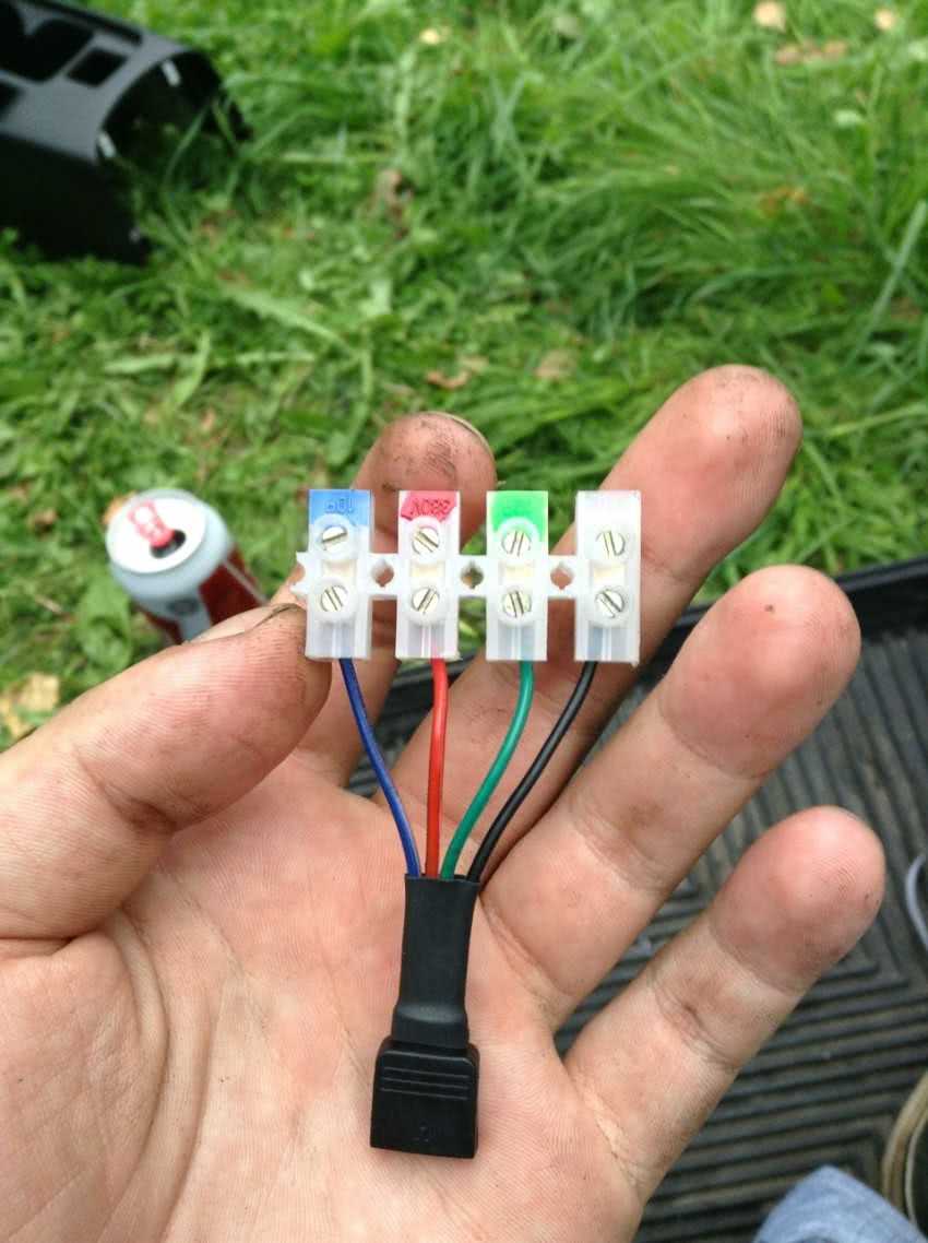 - Далее, с другой стороны, нужно подключить отрезок светодиодной ленты с контроллером, как это сделать смотрите подробно на картинке выше. Соедините четыре провода, 3 из них с соблюдением цветной маркировки, а четвертый провод прикрепите на оставшееся место (он обычно белого или черного цвета).