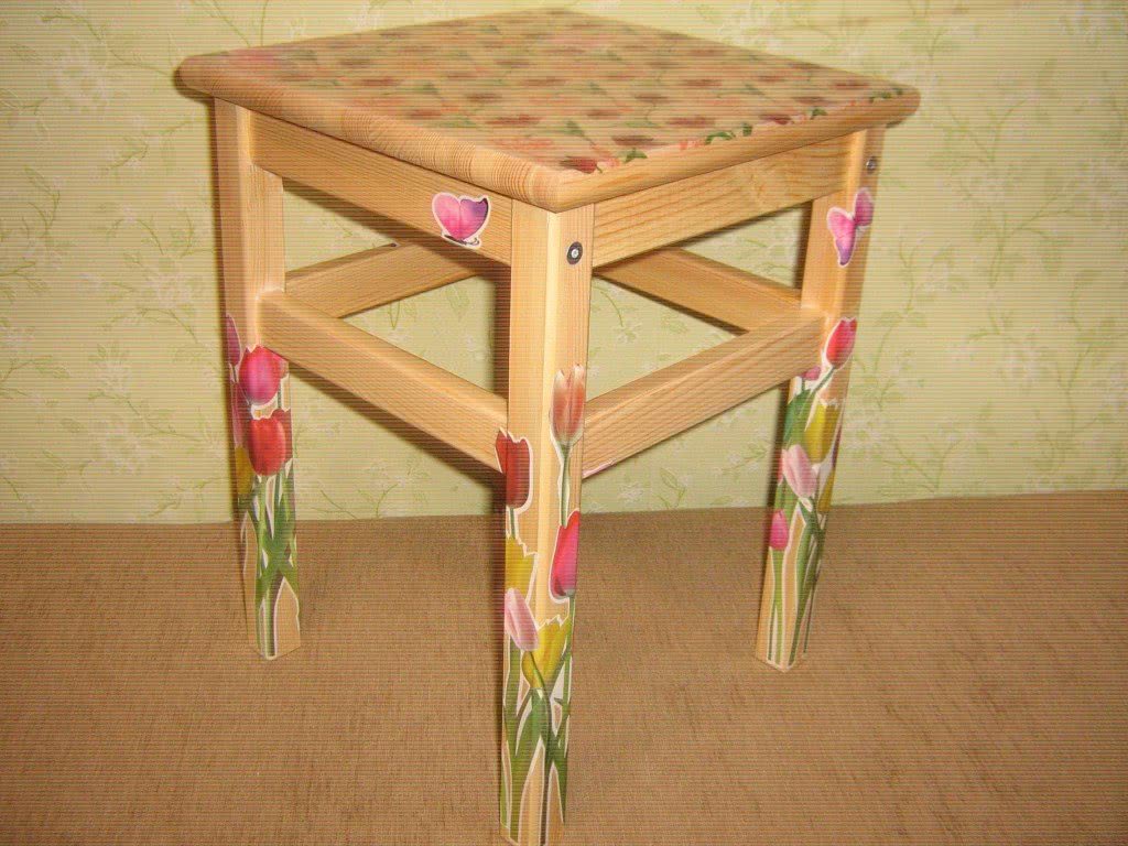 Есть разные варианты доработки табурета своими руками после изготовления – все зависит от фантазии мастера. Можно покрыть его лаком, морилкой, акрилом, нанести декоративные узоры. Украшение комнатной обстановки в технике декупаж – популярное направление мебельного дизайна. С его помощью, без особых денежных затрат, можно преобразить самодельные табуретки в зависимости от стиля помещения. Декорируют мебель салфетками, фотографиями, старыми газетами, страницами из книг или нотных тетрадей. Таким способом можно оформить интерьер в модном винтажном стиле или во французском стиле прованс. Кроме этого, можно пошить на сиденья мягкие чехлы. Накидки, связанные крючком, придадут табуретам неповторимость. В случаях, когда при ремонте меняется стиль интерьера, подчеркнуть индивидуальность жилища можно с помощью декорирования тканями. Также изменится внешний вид изделия при обмотке его деталей джутовой веревкой.