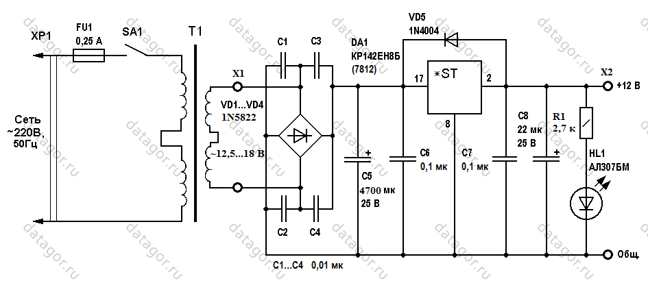 Конденсаторы С1 — С4 шунтируют диоды VD1 — VD4 моста, что позволяет подавлять импульсные высокочастотные помехи, как генерируемые диодами моста, так и проникающие из бытовой сети (~220 В, 50 Гц) через понижающий трансформатор Т1.