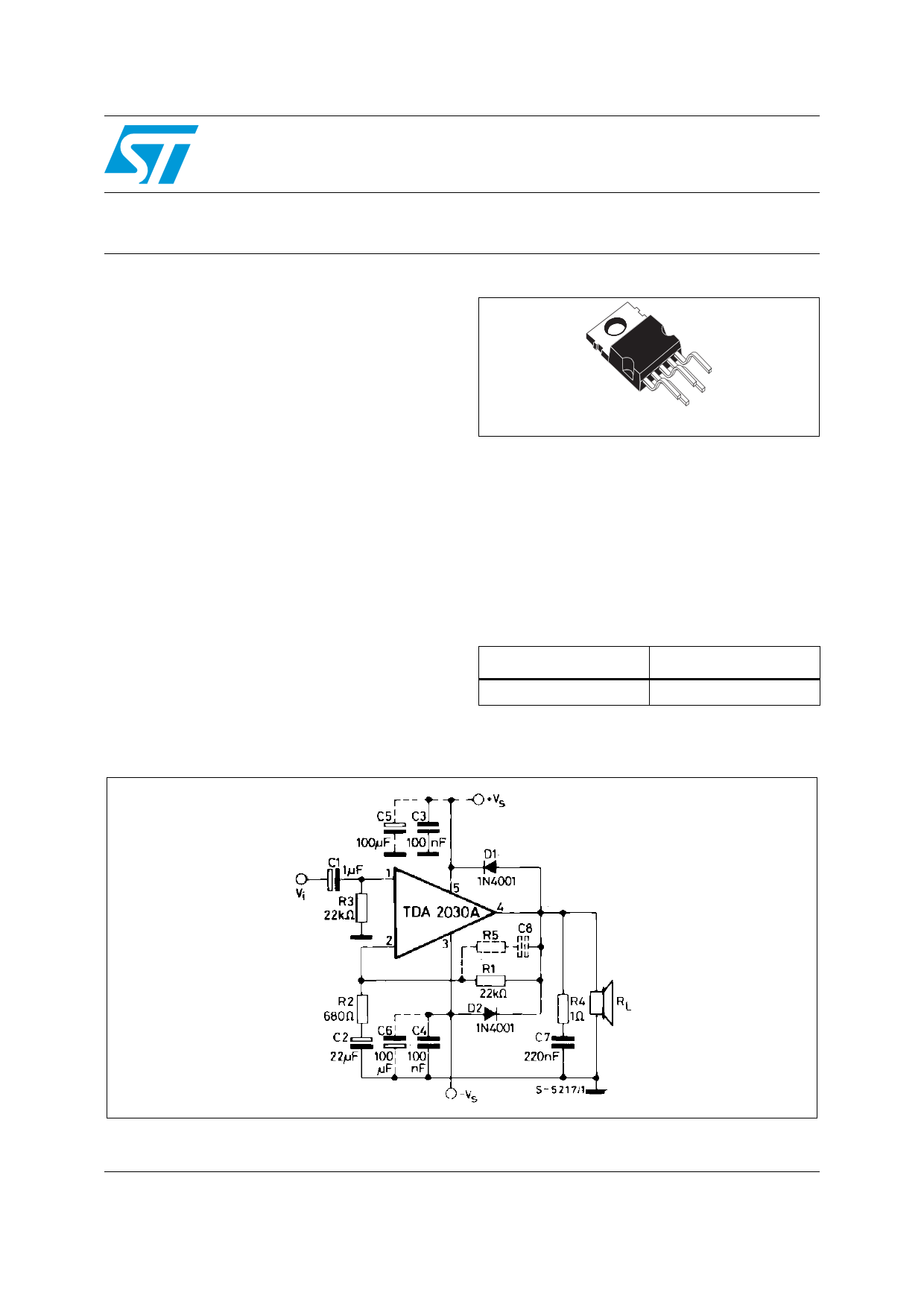 TDA2030A ■ Output power 18 W at VS = ±16 V / 4 Ω with 0.5% distortion ■ High output current )■ Very low harmonic and crossover distortion t(s■ Short-circuit protection uc■ Thermal shutdown rodDescription te PThe TDA2030A is a monolithic IC in a Pentawatt package intended for use as a low-frequency leclass-AB amplifier. soWith VS max = 44 V it is particularly suited for more breliable applications without regulated supply and Ofor 35 W driver circuits using low-cost t(s) -complementary pairs. Pentawatt (vertical) Obsolete ProducFigure 1. Typical application July 2011