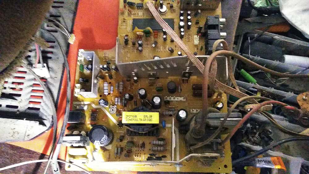 Я услышал высокое напряжение, после чего отключил плату. Дело в том, что нельзя на долго включать плату без ОС, так как на кинескопе не будет магнитного поля, и все лучи будут бить в одну точку. На кинескопе будет показывать всего одна точка по центру экрана. Если в таком положении оставить телевизор работать, то получим прогар кинескопа.