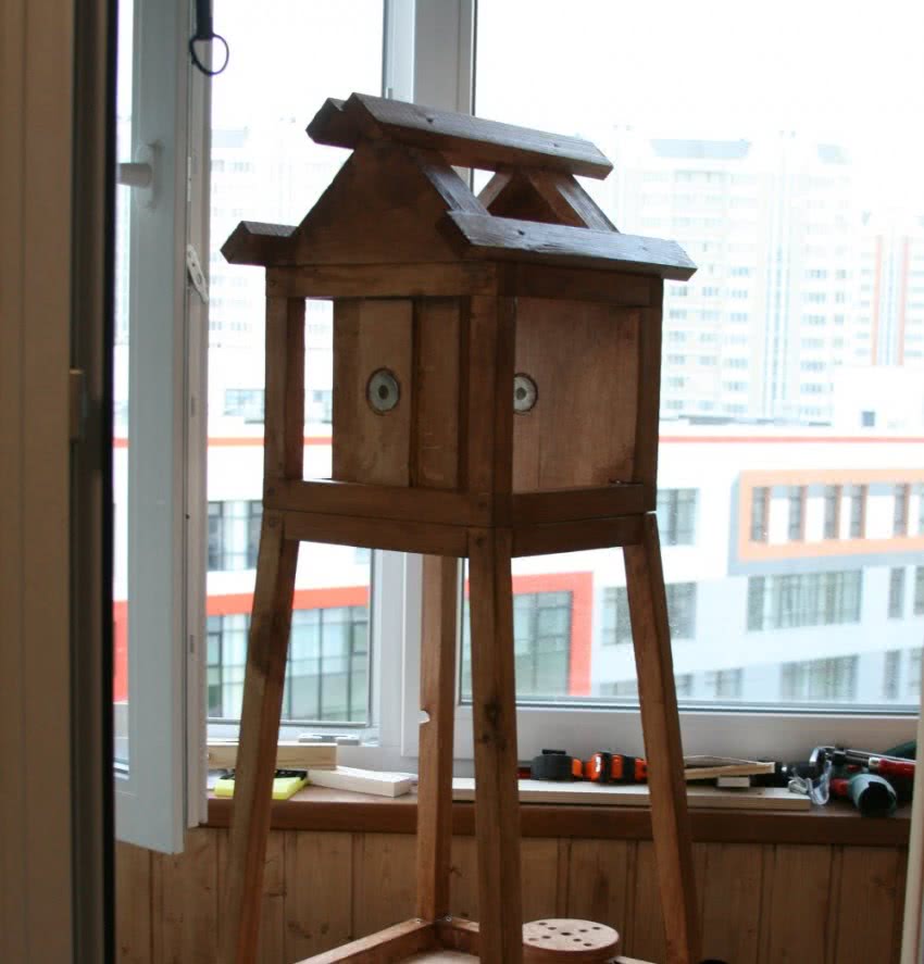 Теперь займемся верхней частью. Из ДВП или фанеры вырезаем 2 равносторонних треугольника. Высоту и длины сторон выбирайте по своему усмотрению. Скрепляем треугольники между собой с помощью отрезков реек и саморезов. Верхнюю часть рекомендую сразу не приворачивать к нижней — так будет удобнее производить обшивку вагонкой. На фото показано, что должно получиться в итоге.