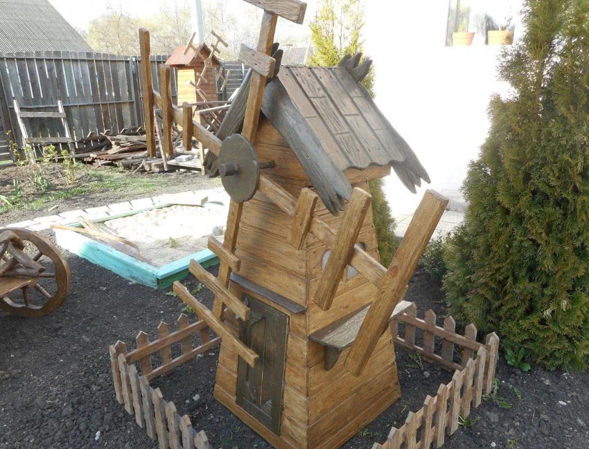 Гармонично будет смотреться поблизости мельницы деревенская телега или брошенное неподалеку деревянное колесо. Если сделать декоративные домики и мельницы для сада в одном стиле, то проблем с размещением композиции будет меньше.