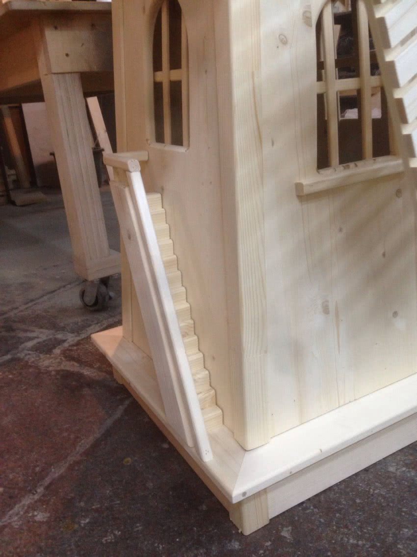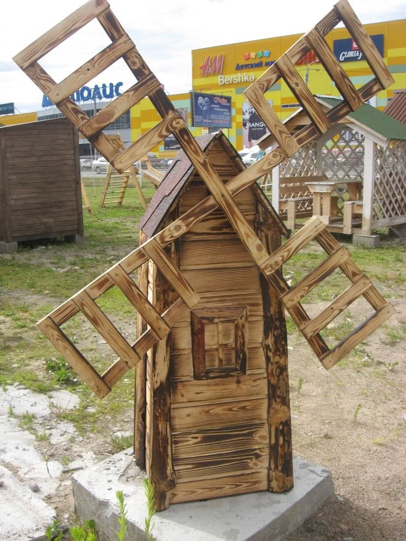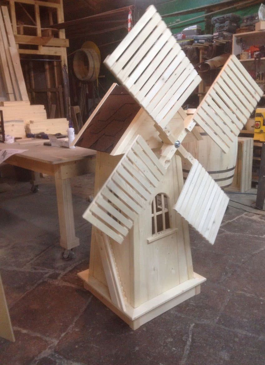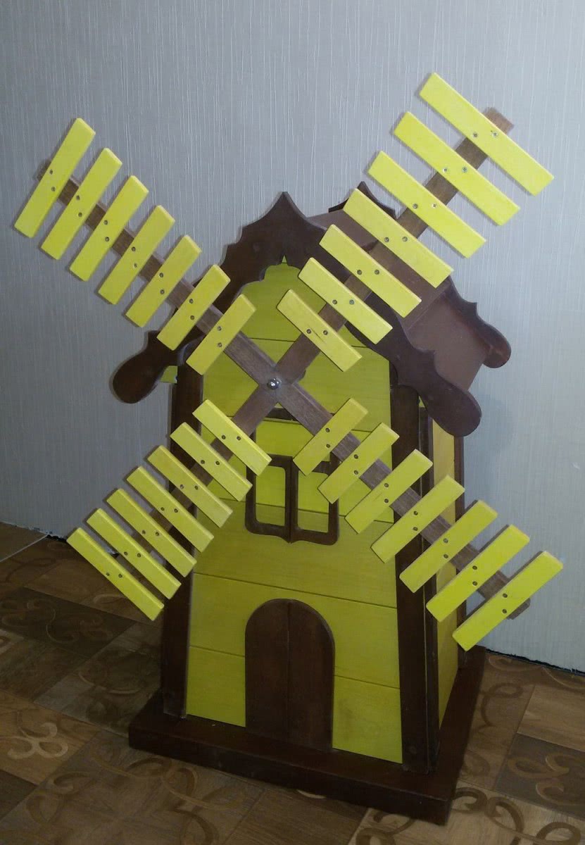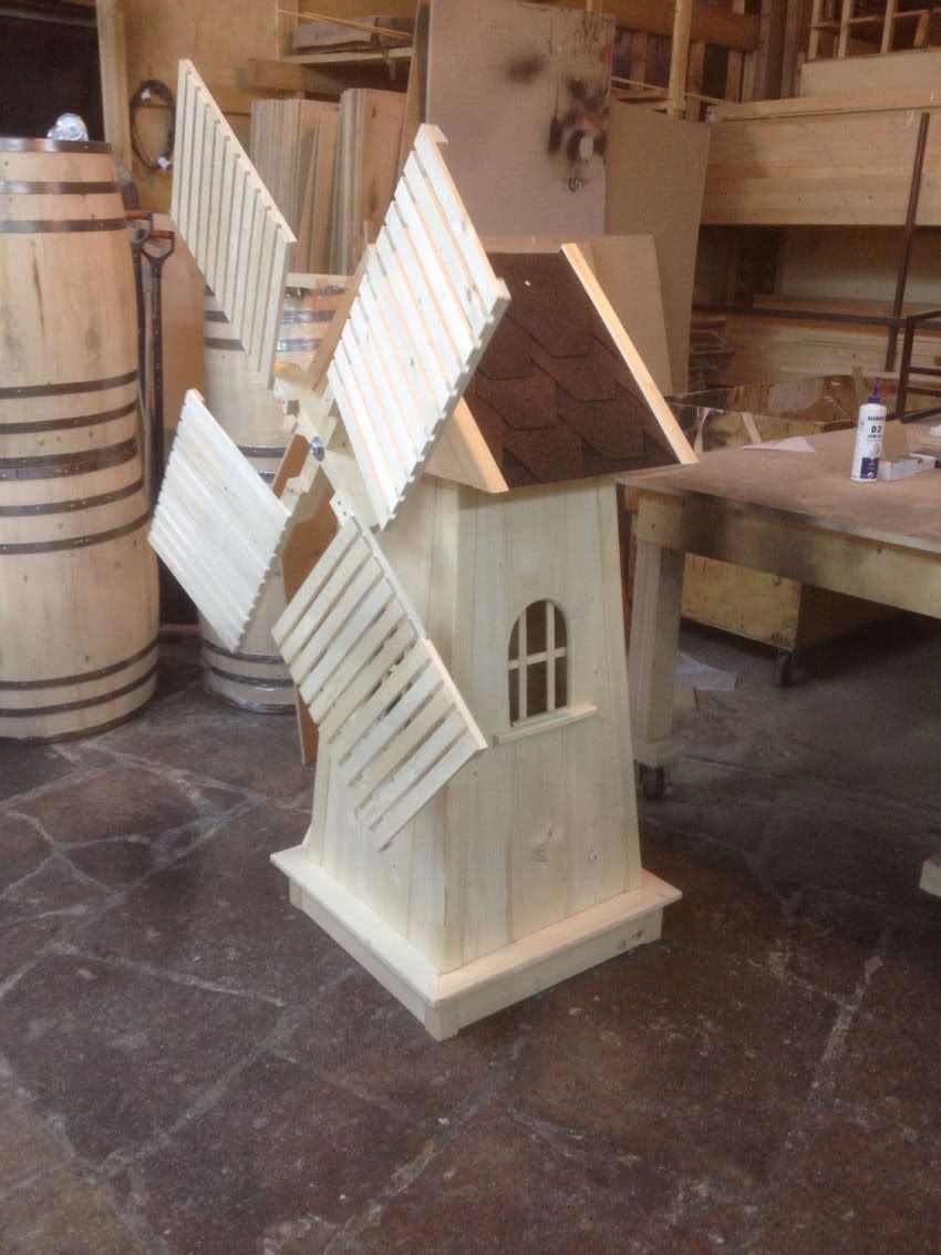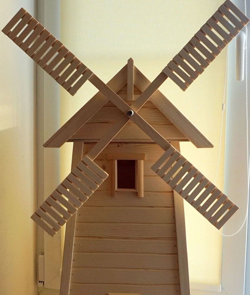 Деревянная мельница готова. Она украшается, покрывается лаком и устанавливается на подготовленную площадку. Готовую модель можно увидеть на фото чуть ниже.